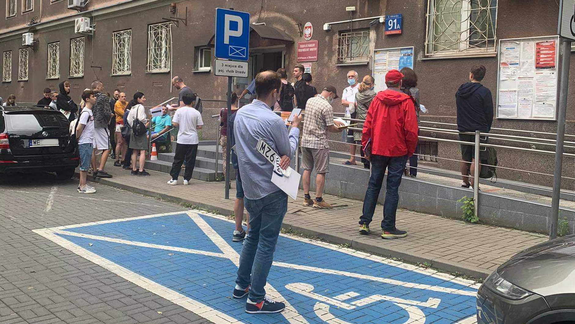 Urząd Dzielnicy Mokotów miasta stołecznego Warszawa, wydział komunikacji, ulica Wiktorska 91A. Najpierw rzuca się w oczy długa kolejka, która sięga ulicy przed budynkiem. Do czekających podchodzi kobieta, która ręcznie rozdaje numerki, a w oknie za kratami jest wystawiona tablica.