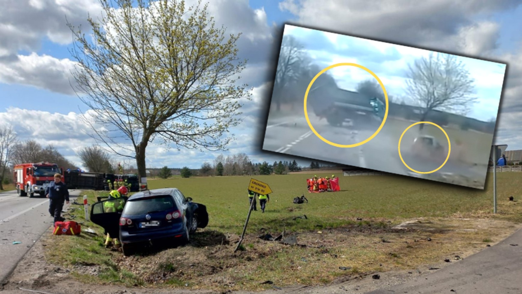 40-tonowa ciężarówka, załadowana sprzętem AGD, na skutek uderzenia przewróciła się na bok i zatarasowała drogę w obu kierunkach. Na miejsce przyjechała policja, która wyznaczyła objazdy oraz przedstawiciele firmy, którzy przeładowali towar do sprawnej ciężarówki. Także Volkswagen nie nadawał się do dalszej jazdy. Siła uderzenia była tak duża, że silnik pojazdu leżał w odległości ok. 20 m od reszty auta. Do zdarzenia doszło w kwietniu, ale dopiero teraz nagranie trafiło do sieci.