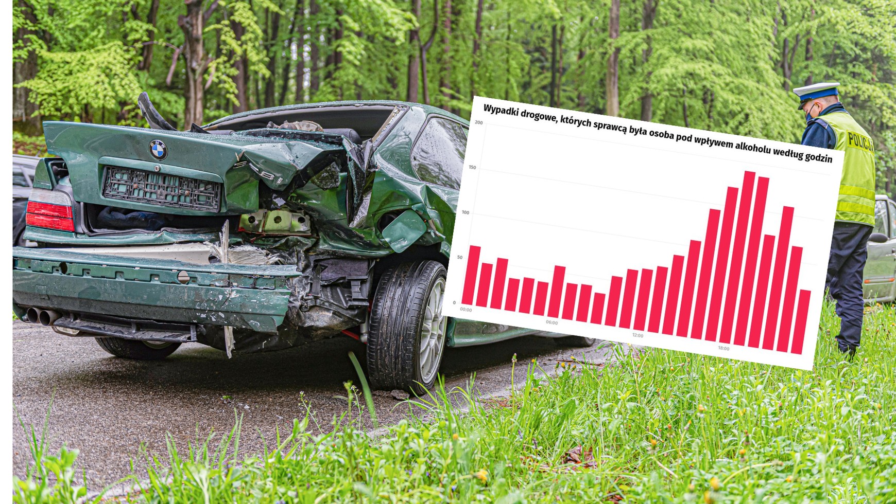 Najbardziej niebezpieczne okazały się godziny wieczorne. W 2023 r. między godz. 17:00 a 20:00 dochodzi do największej liczby wypadków, których sprawcą była osoba pod wpływem alkoholu. Szczyt przypadał na okres między godz. 18:00 a 19:00, kiedy doszło do 191 wypadków. Prawie tak samo źle wypadł przedział 19:00-20:00, w którym odnotowano 187 wypadków.