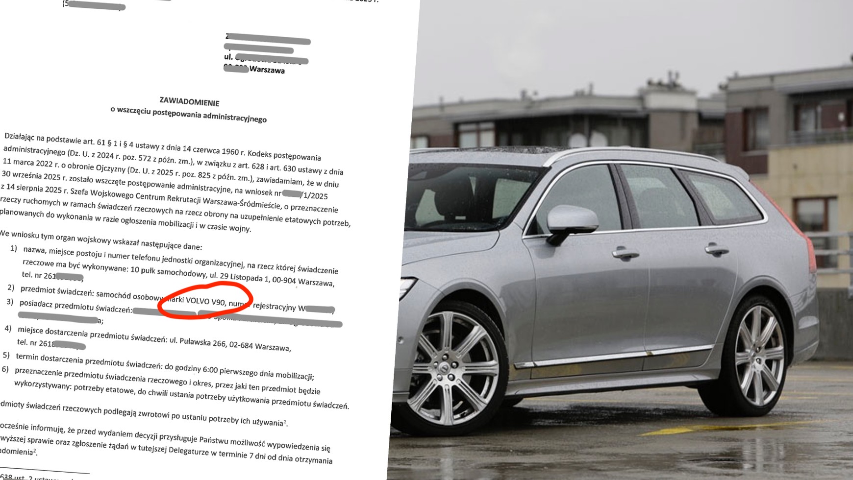 W zawiadomieniu, jakie otrzymał pan Grzegorz, mowa jest o "przeznaczeniu rzeczy ruchomej w ramach świadczeń rzeczowych na rzecz obrony na uzupełnienie etatowych potrzeb planowanych do wykonania w razie ogłoszenia mobilizacji i w czasie wojny". Pan Grzegorz, gdyby zaszła taka potrzeba, będzie miał obowiązek dostarczyć swój samochód, w stanie gotowym do jazdy, do 10 pułku samochodowego w Warszawie. W piśmie jest adres, gdzie należy dostarczyć auto, a nawet numer telefonu, gdyby była konieczność ustalenia jakichś szczegółów. Planowane wykorzystanie samochodu to "potrzeby etatowe" (cokolwiek by to miało znaczyć). Na jak długo? Dopóki będzie potrzebny.