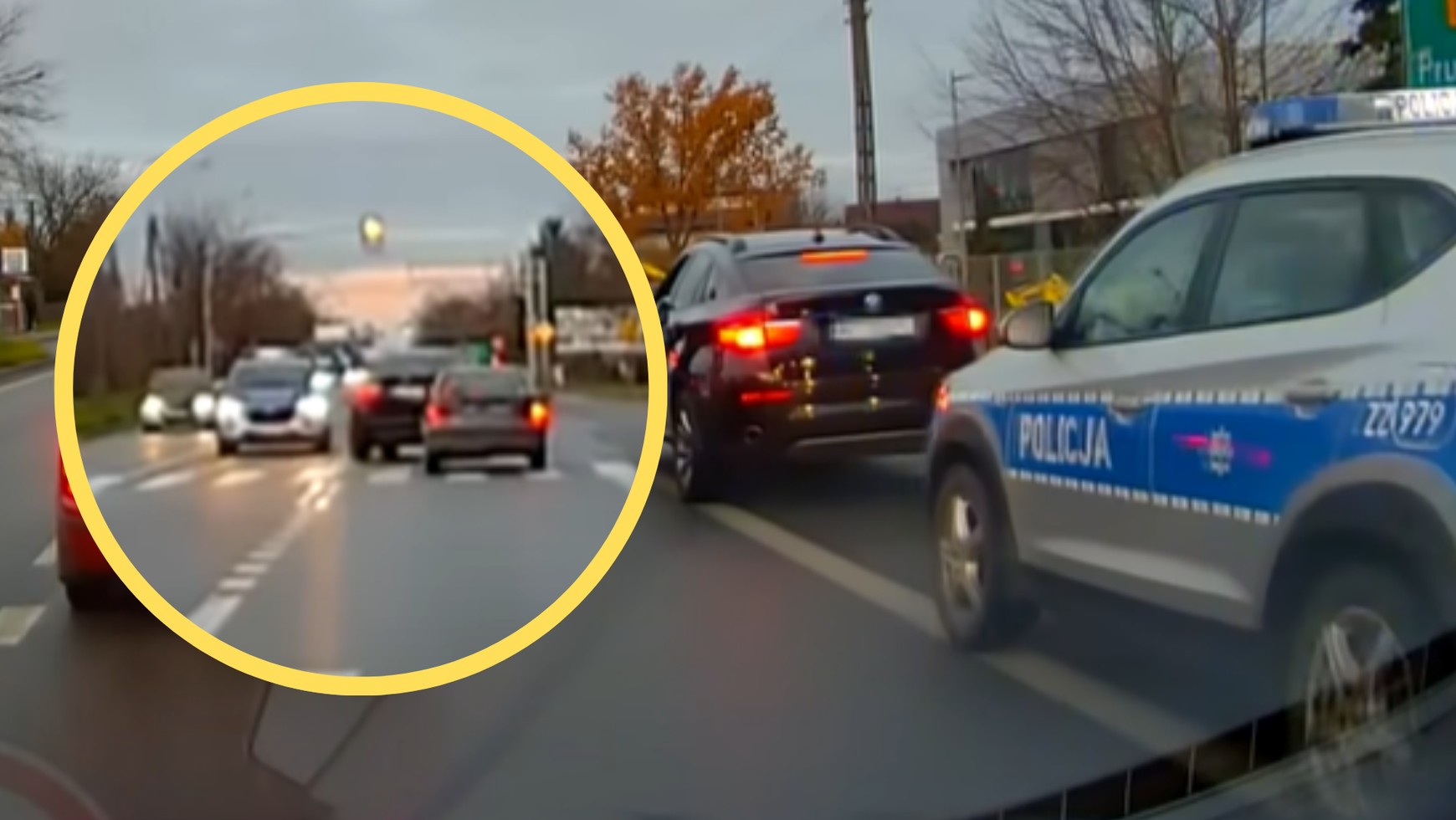 Wszystko to tuż przed maską policyjnego radiowozu nadjeżdżającego akurat z naprzeciwka wraz z innymi samochodami, które również korzystały wówczas z zielonego światła. Nagranie z niebezpiecznej sytuacji, która miała miejsce w poniedziałek, 18 listopada, zostało opublikowane na kanale "Stop Cham" na YouTube.