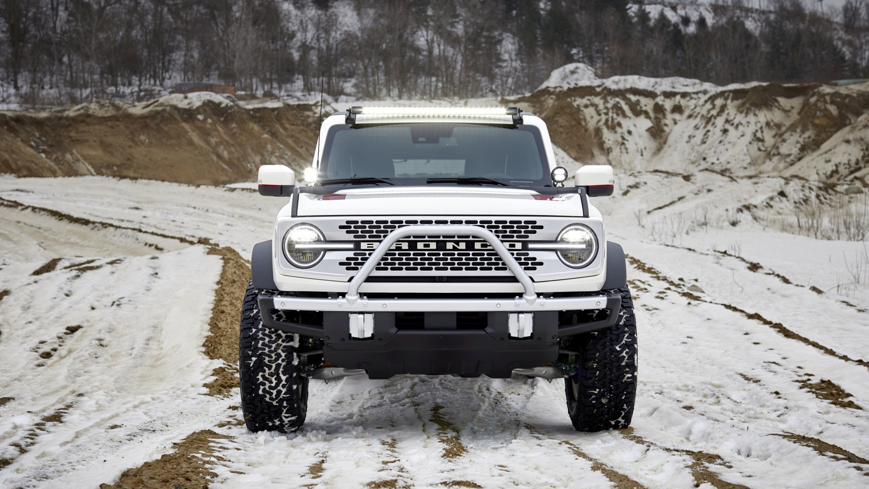 Dalszy ciąg artykułu pod materiałem wideoEgzemplarz wystawiony na sprzedaż to odmiana Bronco First Edition z silnikiem V6 2,7 l o mocy 310 KM i napędem 4x4. To dość bogato wyposażona wersja z pakietem akcesoriów Ford Performance (m.in. orurowanie, listwa świetlna, oświetlenie boczne, schowki) i wzmocnionym zawieszeniem (oś Dana 44, amortyzatory Bilstein), opcjonalnymi felgami 18” i wykończeniem wzorowanym na egzemplarzu z lat 60. Stąd niedostępny obecnie biały lakier Wimbledon White (nawiązanie do odmiany z 1966 r.) czy czerwone pasy i dodatkowe srebrne elementy (grill, zderzaki).
