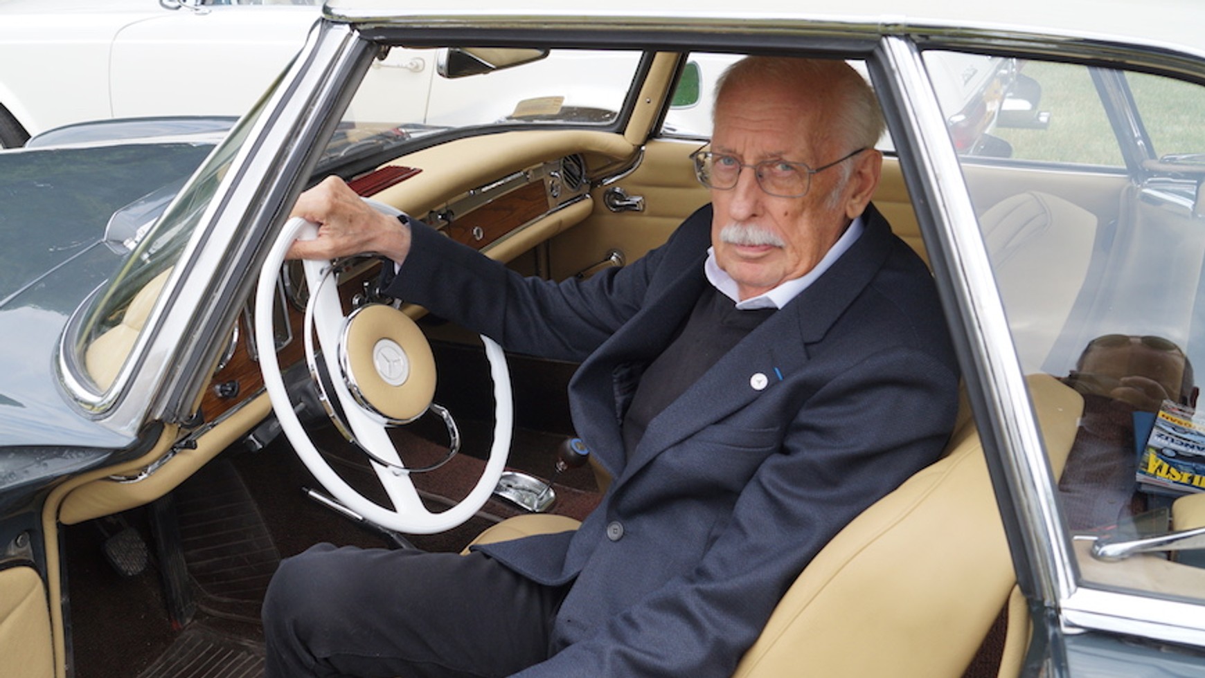 Paul Bracq w Polsce – stylista przy zaprojektowanym przez siebie Mercedesie Pagoda. Zdjęcie z 2015 r. kiedy to Paul Brack odwiedził Polskę po raz pierwszy