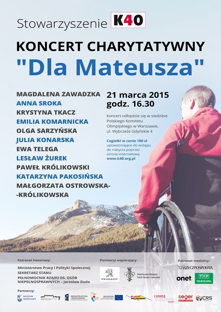 Koncert charytatywny w Polskim Komitecie Olimpijskim rozpocznie się 21 marca 2015 r. o godzinie 16.30. By wziąć udział w wydarzeniu i wspomóc marzenie Mateusza należy zakupić okolicznościową cegiełkę, upoważniającą do wstępu w cenie 100 zł od osoby. W trakcie imprezy zostanie zapewniony catering. Cegiełki są dostępne do kupienia poprzez stronę internetową: www.k40.org.pl lub w siedzibie Stowarzyszenia K40 w Komorowie.