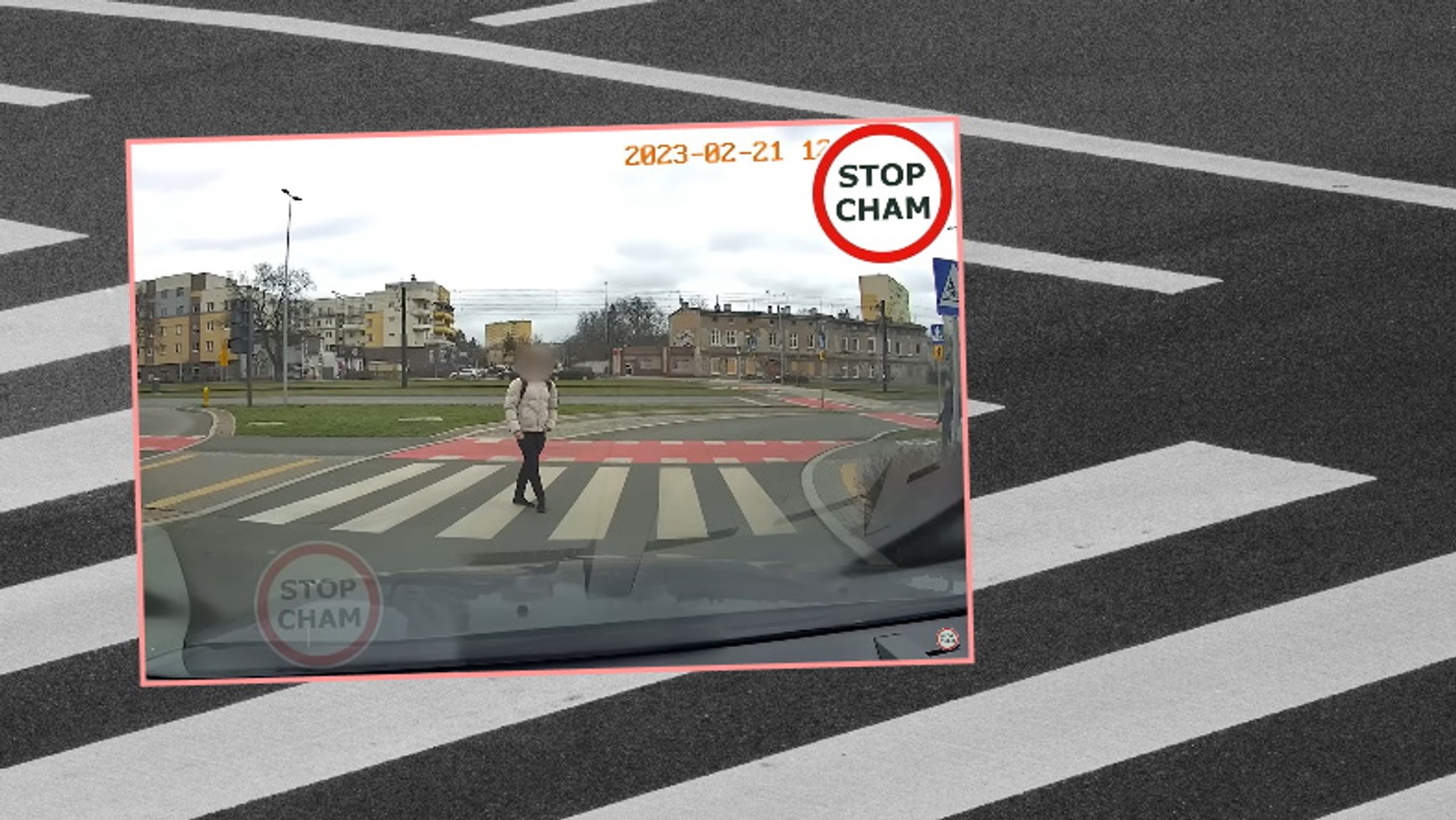 Na filmie widać, jak przechodzień, kiedy zauważa zbliżający się do przejścia dla pieszych samochód, postanawia zatrzymać się na środku pasów. Chwilę się rozgląda, obraca się i idzie dalej, w końcu umożliwiając kierowcy przejazd.