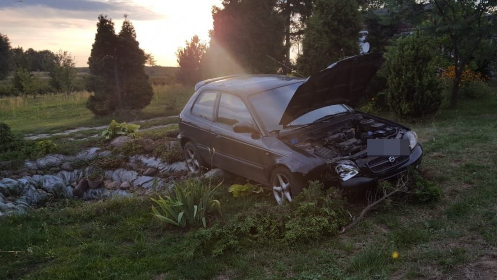 Jak się okazało, mężczyzna stracił panowanie nad samochodem, zjechał z drogi, staranował dwie rosnące na posesji tuje i zatrzymał się dopiero na kamieniach otaczających oczko wodne.