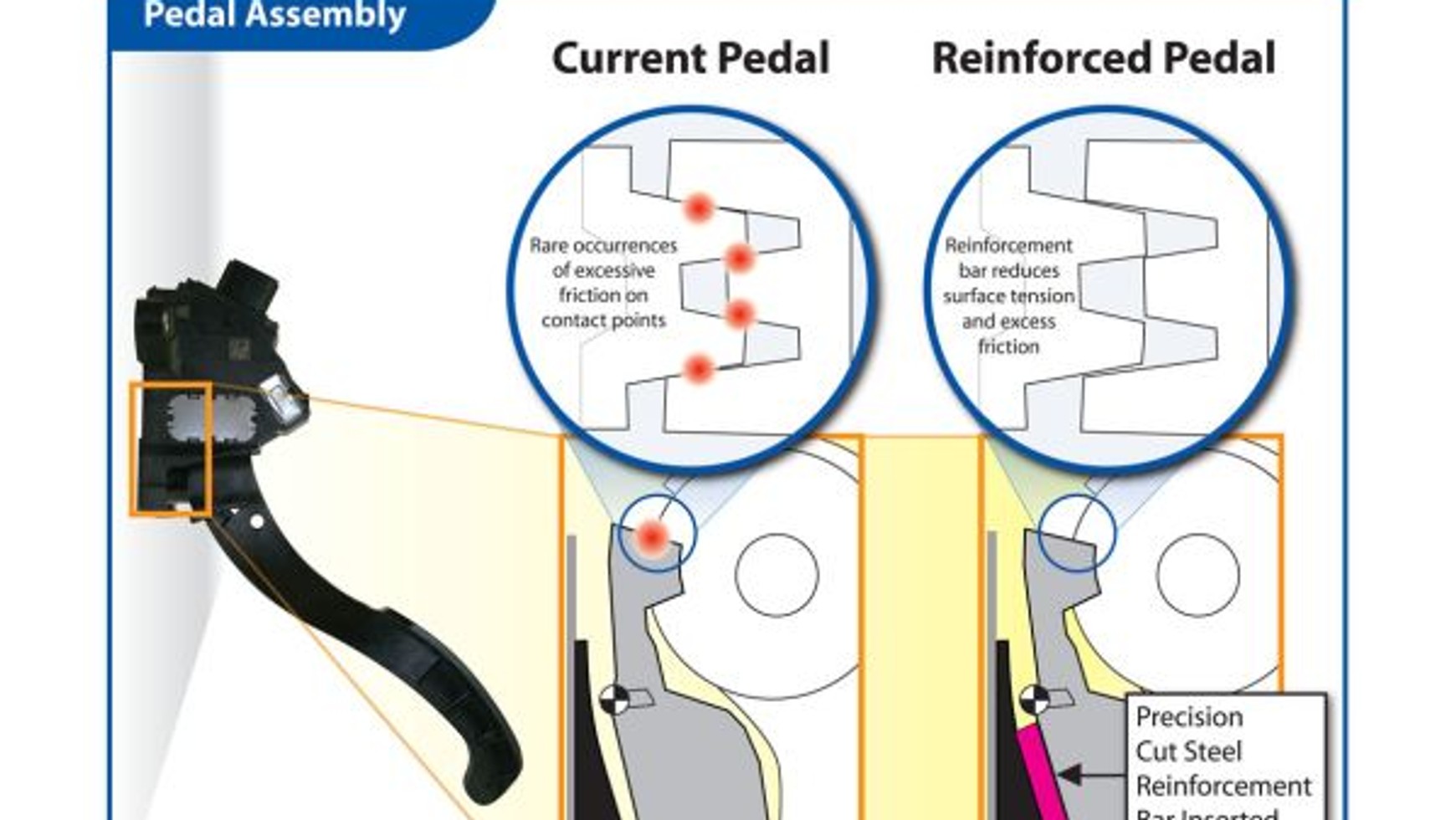 Inżynierowie Toyoty opracowali i drobiazgowo przetestowali rozwiązanie obejmujące wzmocnienie zespołu pedału w celu wyeliminowania potencjalnego zagrożenia wzrostu tarcia, które w skrajnych przypadkach może powodować zacięcie pedału.