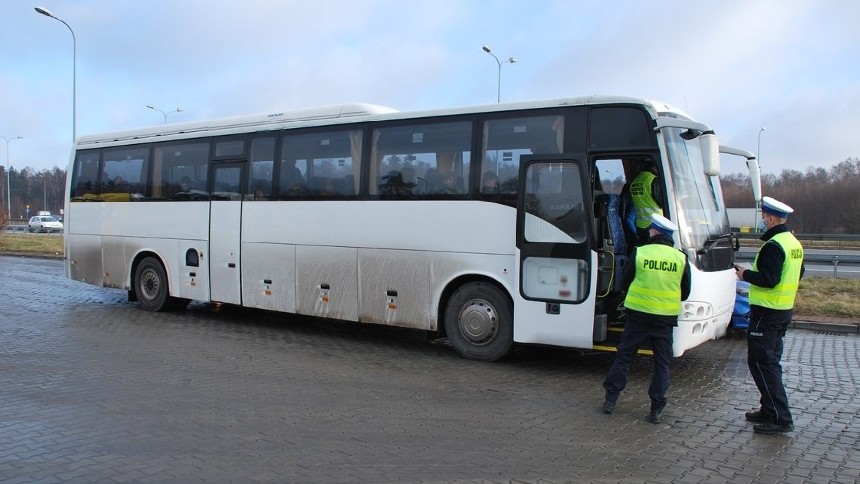 Punkt kontroli autokarów na ŚląskuŚląska Policja;