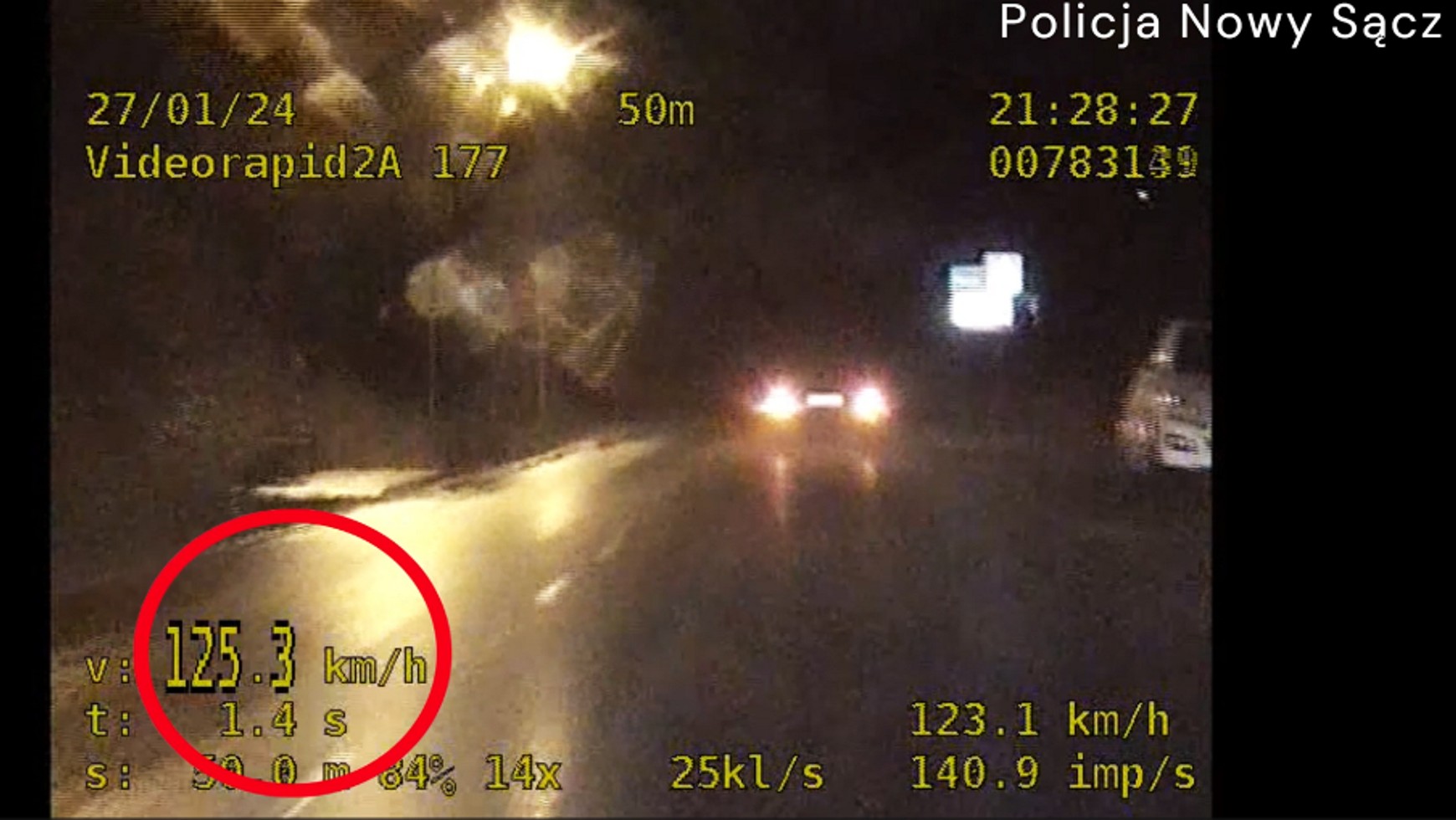 W sobotę 27 stycznia, około godziny 21:30, policjanci z grupy SPEED patrolujący ulice Nowym Sączu zauważyli auto, które mimo niesprzyjających warunków atmosferycznych, poruszało się zdecydowanie szybciej, niż pozwalają na to przepisy. Wideorejestrator w radiowozie wskazał prędkość 125 km/h, co oznaczało, że kierowca przekroczył dozwoloną prędkość w obszarze zabudowanym aż o 75 km/h. Wobec tego funkcjonariusze postanowili zatrzymać go do kontroli drogowej.