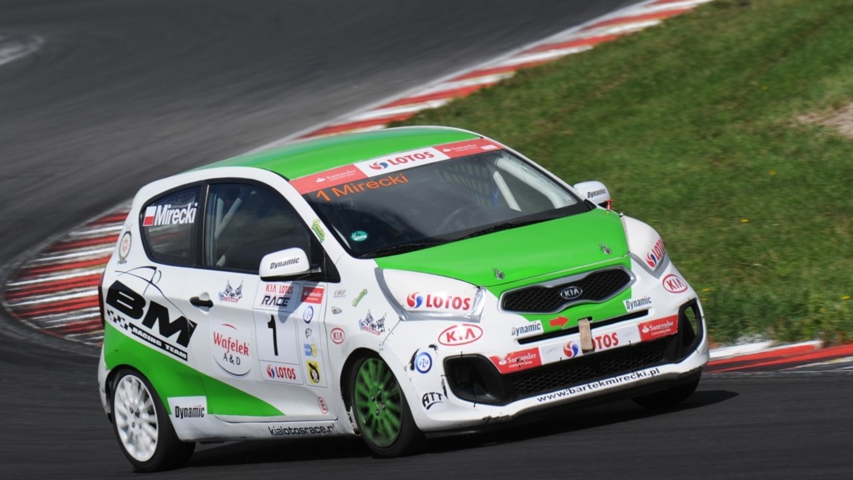 Niedzielne wyścigi ułożyły się po myśli reprezentanta BM Racing Team. W pierwszym biegu Bartłomiej Mirecki doskonale wystartował z pole position i nie oddał prowadzenia aż do mety (nie pierwszy raz w tym sezonie). Jedynym zagrożeniem dla 17-letniego mistrza był Stanisław Kostrzak, który przez trzy okrążenia utrzymywał się blisko zderzaka biało-zielonego Picanto. Niestety na czwartym kółku znalazł się poza asfaltem, dzięki czemu Mirecki mógł bezpiecznie podążać po zwycięstwo. Pierwszą trójkę uzupełnili Filip Tokar oraz Konrad Wróbel. Wyścig doprowadził do mety Safety Car, który pojawił się na torze po mocnym uderzeniu w bandę przez Grzegorza Kubata. Na szczęście zawodnikowi nic się nie stało.