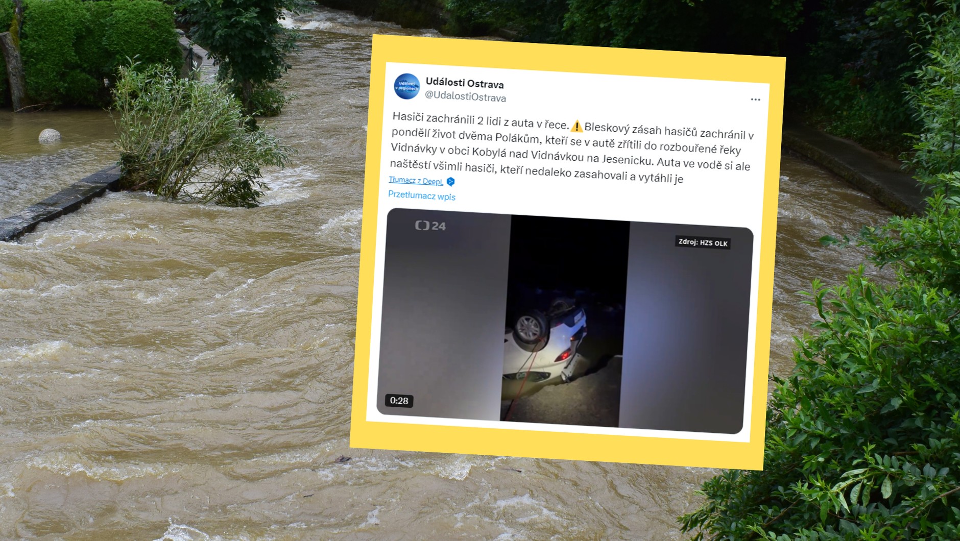 W miniony poniedziałek (16 września) w miejscowości Kobyla w pobliżu sąsiadującego z Polską miasta Vidnava w Czechach doszło do niebezpiecznej sytuacji drogowej spowodowanej powodzią. Dwójka Polaków wjechała samochodem do rwącej rzeki Vidnavki. Czescy strażacy, którzy byli w pobliżu w związku z inną akcją, szczęśliwie zauważyli samochód i wyciągnęli z niego obydwie osoby.