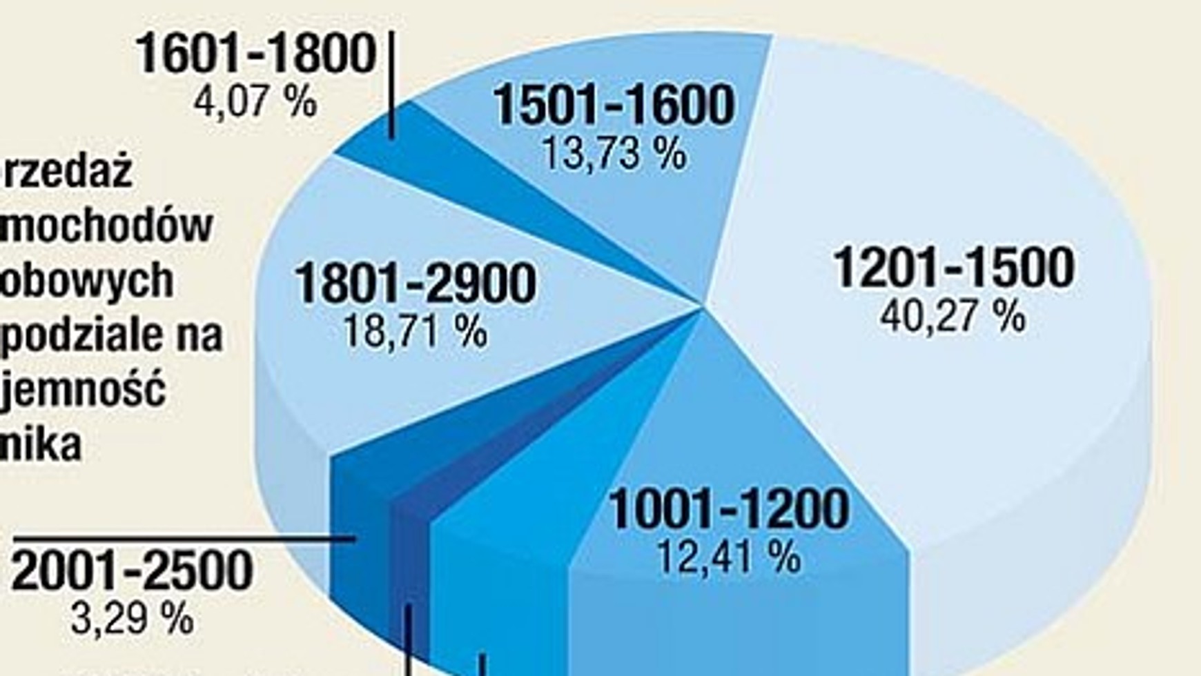 W 2005 roku auta o poj. 0-1000 ccm stanowiły 5,27 proc., w tym roku 5,53 proc. Udział pojazdów wyposażonych w jednostki o poj. 1,0-1,2 l zmalał w tym roku do 12,4 proc. (rok temu 14,3 proc.). Nieznacznie spadła także sprzedaż samochodów z silnikami 1.6-1.8 oraz 1.8-2.0. Maleje również udział pojazdów wyposażonych w największe motory przekraczające poj. 2,5 l - z 2,33 proc. do 1,98 proc. Klienci z tej grupy przerzucili się na samochody z silnikami o poj. 2,0-2,5 l (3,29-proc. udział).Sprzedaż aut w zależności od pojemności silnika oraz rodzaju paliwa przedstawia się następująco. W przedziale 0-1200 ccm diesle nie są oferowane. W miarę wzrostu poj. silnika udział kupowanych samochodów z dieslami rośnie z 24,9 proc. (1,2-1,5 l) do 83,3 proc. w grupie 2,0-2,5 l. Klienci decydujący się na pojazdy napędzane największymi silnikami (pow. 2,5 l) nieco rzadziej wybierają diesle - 63,3 proc.Najchętniej wybierane auta z silnikami o pojemności 1201-1500 ccm występują z nadwoziem hatchback 5d (8402 pojazdy). Na drugim miejscu są auta typu kombi (1807), a na trzecim sedany (1682). Hatchbacki 3d z silnikami 1.2-1.5 kupiło w tym roku 1187 klientów, vany 899 osób, a kombivany 712.Więcej: http://www.samar.pl