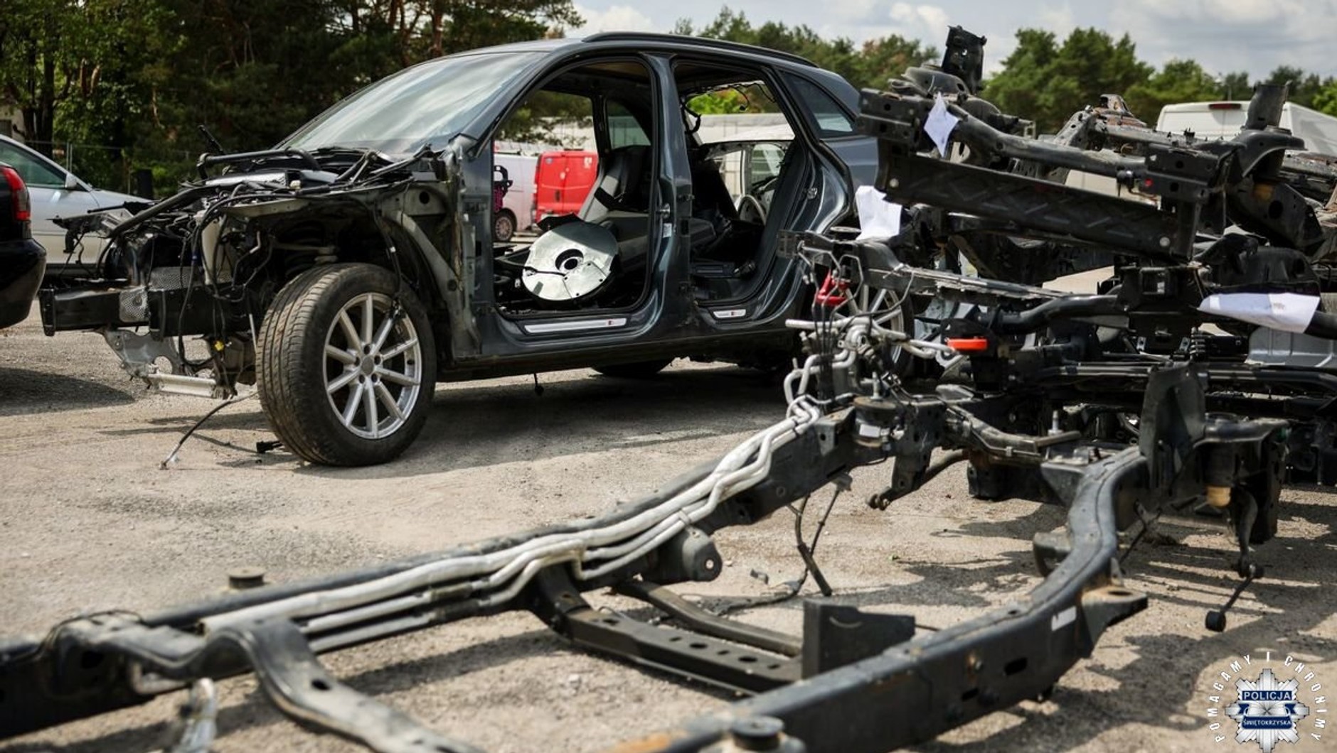Przeszukania przeprowadzone na trzech posesjach pod Kielcami oraz jednej w powiecie buskim ujawniły bardzo dużą skalę działalności grupy. Policjanci zabezpieczyli ponad 40 pojazdów różnych marek, setki części samochodowych, motocykle, a także kilkanaście kompletów polskich i zagranicznych tablic rejestracyjnych oraz 50 dowodów rejestracyjnych.