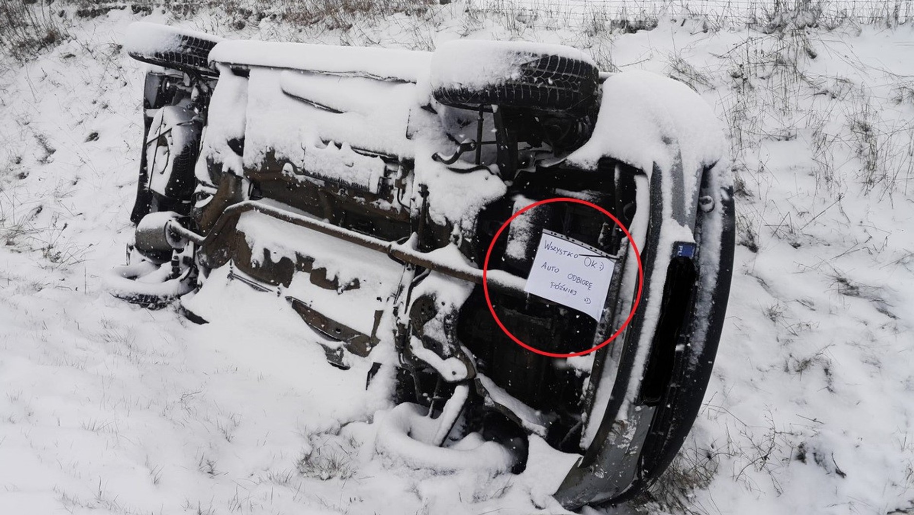 Kiedy dotarli na miejsce w okolicy ani wewnątrz pojazdu nikogo nie było. Była za to kartka przyczepiona do leżącego na boku auta. "Wszystko OK! Auto odbiorę później" — mogli przeczytać policjanci. "Kierujący zapewne nie chciał nikogo martwić i miał świadomość, że widok wywróconego w rowie auta może zaniepokoić innych użytkowników drogi" — policjanci próbują odczytać intencje autora karteczki.