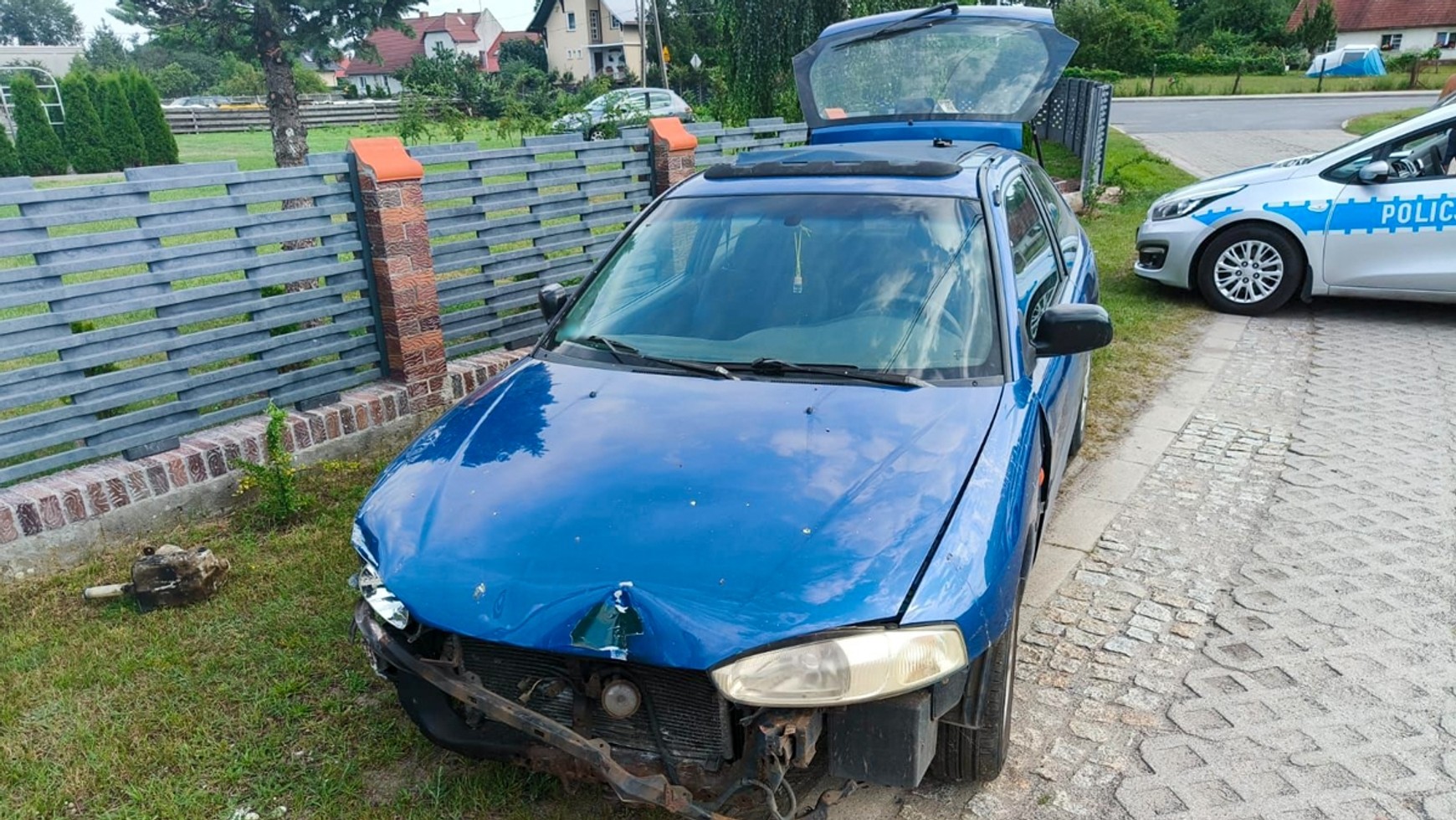 Funkcjonariusze zaczęli od sprawdzenia, czy nie ma poszkodowanych. Szczęśliwie nikt nie znalazł się na kursie Mitsubishi, a jedyną osobą, którą zastali na miejscu, był młody kierowca. Straty? Tylko materialne: uszkodzony samochód, naruszone ogrodzenie posesji i znak.