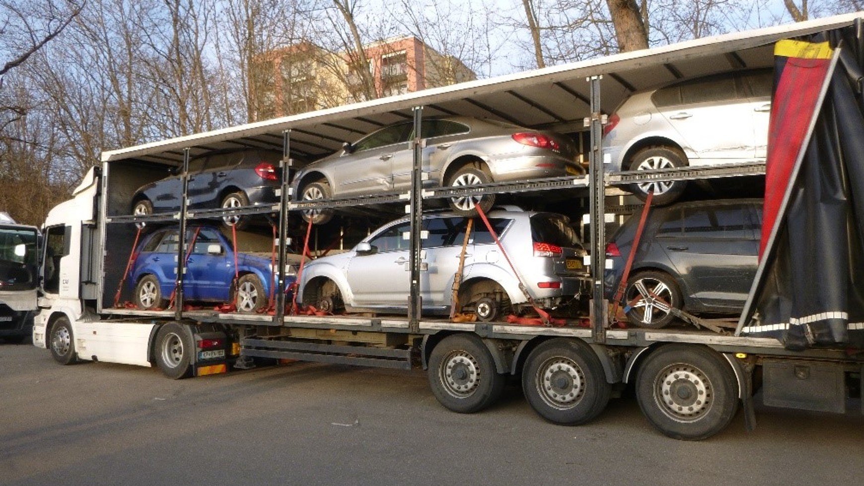 Podejrzenia o przekroczeniu dopuszczalnej wysokości okazały się trafne. W trakcie kontroli okazało się, że naczepa miała przewyższenia o 15 cm, które nie spełniały wymogów określonych w przepisach (łączna wysokość zestawu to aż 4,15 m). Po uchyleniu kurtyn okazało się, że w naczepie zmieszczono aż sześć używanych samochodów osobowych w nieodpowiedniej konstrukcji, która została nadmiernie obciążona. Co gorsza, pojazdy zabezpieczono zużytymi i uszkodzonymi pasami mocującymi. Nie powinny zatem dziwić policyjne doniesienia o drzwiach zdeformowanych przez ładunek.