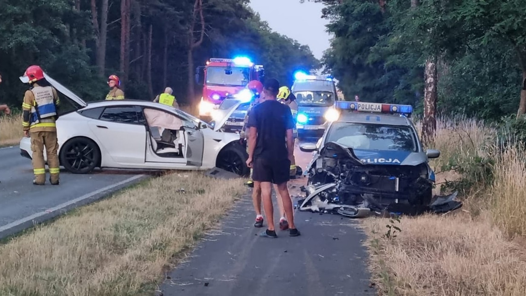 O wypadku z udziałem dwóch policjantów w radiowozie i dwóch mężczyzn w Tesli, do którego doszło w sobotni wieczór, poinformowała Ochotnicza Straż Pożarna w Święciechowie. Strażacy skierowali tam tylko jeden zastęp, ale na miejscu wsparła ich jeszcze załoga Jednostki Ratowniczo-Gaśniczej z Leszna – bynajmniej nie w gaszeniu jakiegokolwiek pożaru, lecz udzielaniu pomocy poszkodowanym.