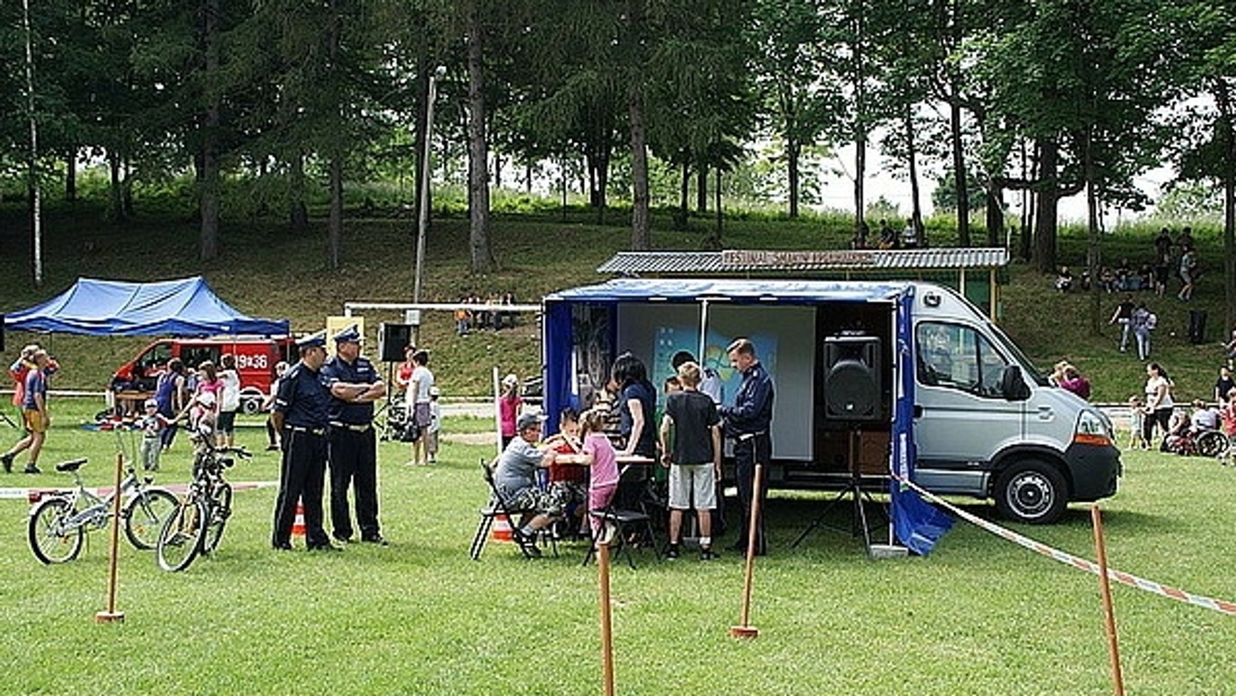 Poza tym sprzętem, samochód wyposażony jest również rowerowy tor przeszkód z równoważnią, rynną i pachołkami. Całość uzupełnia specjalne policyjne stoisko - namiot z krzesełkami i stolikiem, a także sprzęt audiowizualny - projektor, ekran i system nagłośnieniowy z bezprzewodowymi mikrofonami. Właśnie w takim policyjnym namiocie podczas plenerowych spotkań z dziećmi policjanci rozdają broszury przypominające o zasadach bezpieczeństwa w ruchu drogowym.