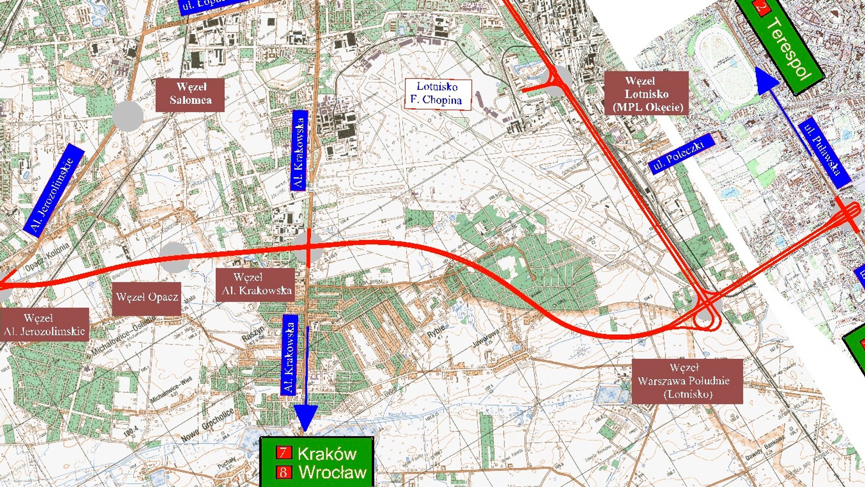 Podróżujący z zachodu autostradą A2 lub ekspresową ósemką z Bemowa czy Bielan, na węźle Konotopa wjeżdżają na trasę główną, gdzie mają do dyspozycji po trzy pasy ruchu w każdym kierunku.