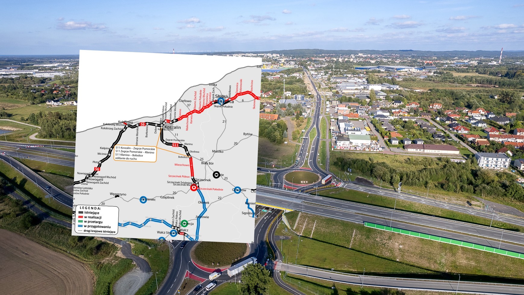 Na nowym odcinku wykonawcy drogi S11 wybudowali 38 wiaduktów i pięć węzłów drogowych. Do 2030 r. cała trasa połączy Kołobrzeg ze śląską aglomerację i będzie prowadziła przez Piłę, Poznań oraz Kępno. Docelowo długość trasy sięgnie ponad 580 km, a wraz ze wspólnym przebiegiem drogi ekspresowej S6 pomiędzy Kołobrzegiem i Koszalinem niemal 620 km. Obecnie do ruchu oddano ok. 200 km całej trasy.