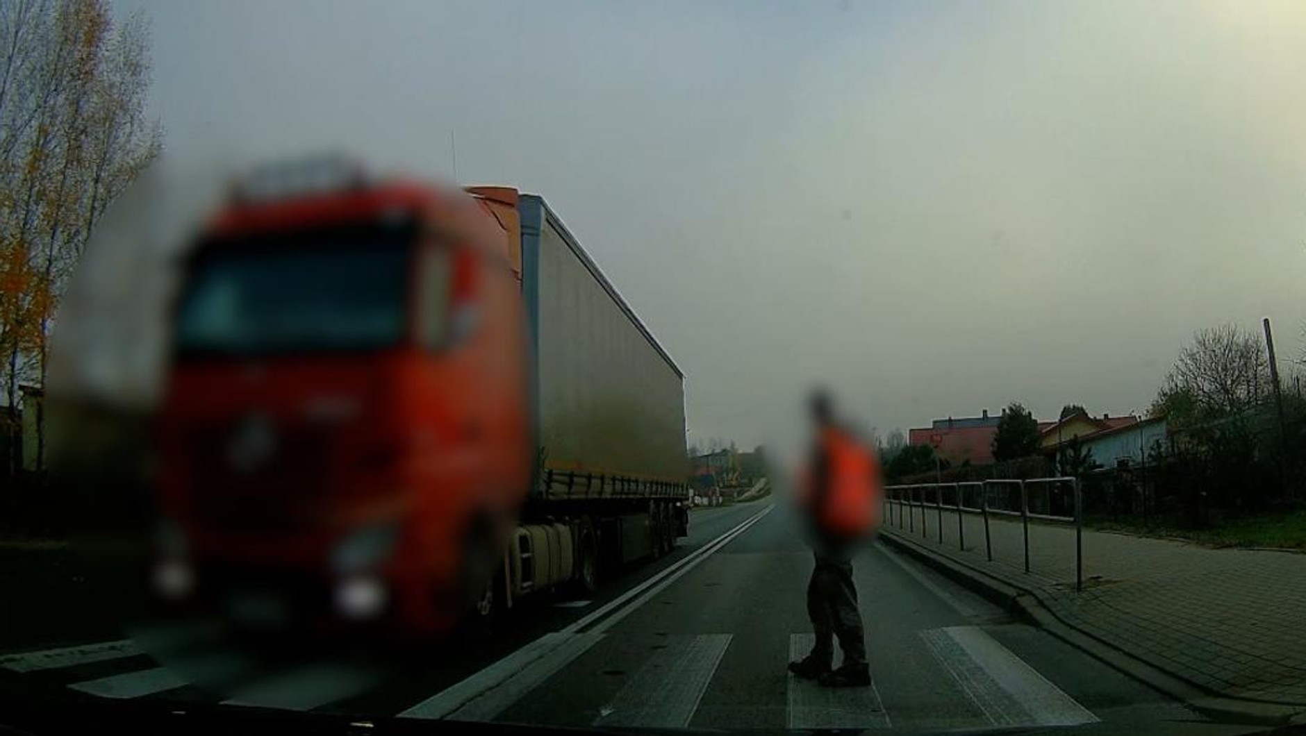 Pieszy ubrany w kamizelkę odblaskową był już na przejściu. Kierowca ciężarówki, który nadjeżdżał z jego prawej strony, jednak nie zwalniał – zagapił się albo zamyślił, nie widział pieszego. Cała sytuacja rozgrywała się na oczach (a także w oku kamery) inspektorów CANARD (Centrum Automatycznego Nadzoru nad Ruchem Drogowym). Kierowca ciężarówki nie zatrzymał się, niemal przejechał pieszemu "po butach". Gdy poniewczasie zorientował się w sytuacji (spowodowanie ewidentnego zagrożenia, obecność samochodu ITD), zatrzymał się kawałek dalej, zdając sobie sprawę z tego, że i tak pojadą za nim. Tak też się stało: załoga radiowozu zawróciła, kierowca został wylegitymowany, a następnie ukarany mandatem w wysokości 1500 zł. Dodatkowo "zarobił" 15 punktów karnych.