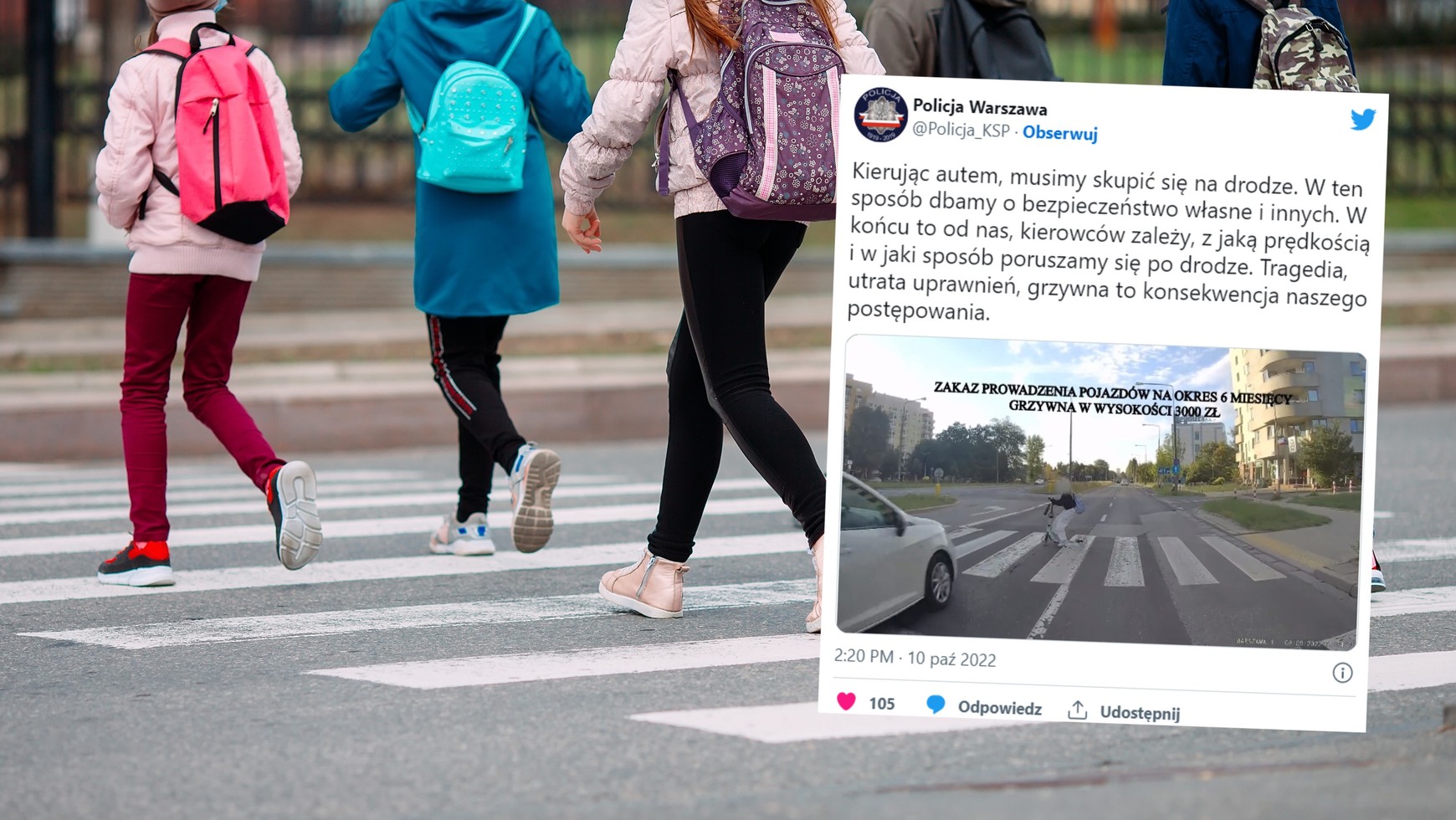 Policja w opisie materiału apeluje o to, aby kierujący samochodami skupiali się na drodze, ponieważ dzięki temu dbamy o bezpieczeństwo swoje i innych. Służby zaznaczają, że takie zachowania mogą skończyć się tragedią, utratą uprawnień i grzywną. Pirat drogowy, który prawie przejechał dziecko na przejściu, został ukarany mandatem w wysokości trzech tys. zł oraz zakazem prowadzenia pojazdów na sześć miesięcy.