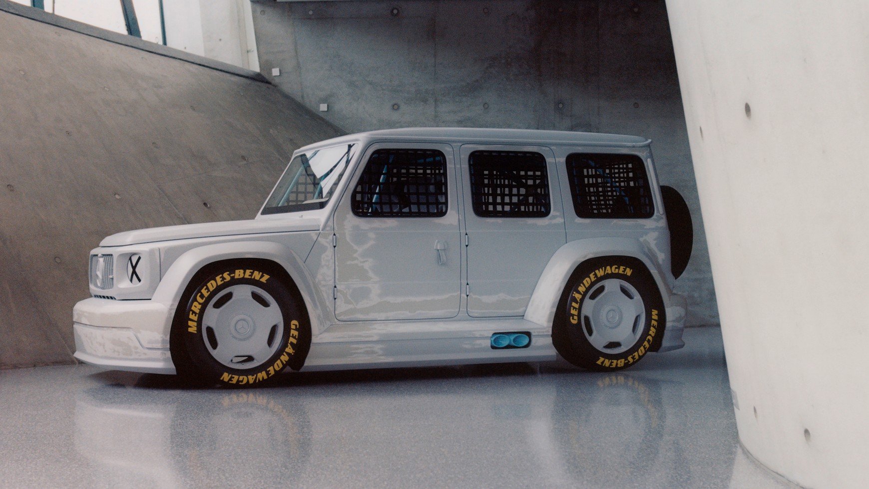 W wyniku prac przerobiono klasę G na coś, co wygląda jak wyścigówka, choć nigdzie nie udało nam się znaleźć informacji, czy finalne dzieło jeszcze jeździ. Zawieszenie zostało radykalnie obniżone. Powiększono progi i zderzaki i zamontowano wielkie felgi z modelu AMG GT 4-door oraz wyczynowe opony, które ozdobiono żółtymi napisami. Koła szczelnie wypełniają nadkola. Biały lakier został miejscami wytarty papierem ściernym, białą farbą potraktowano światła i grill. Klamki z przodu zastąpiono pętelkami, natomiast tylne zostały usunięte – jak w złotej erze tuningu...
