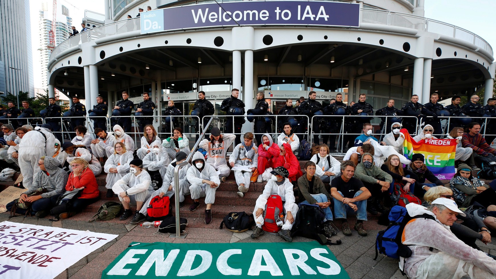 Demonstranci, którzy tłumnie pojawili się przed centrum targowym we Frankfurcie, w którym odbywa się salon samochodowy, żądali „czystego powietrza dla wszystkich”, podczas gdy wielki, czarny, nadmuchiwany samochód dryfował nad ich głowami.