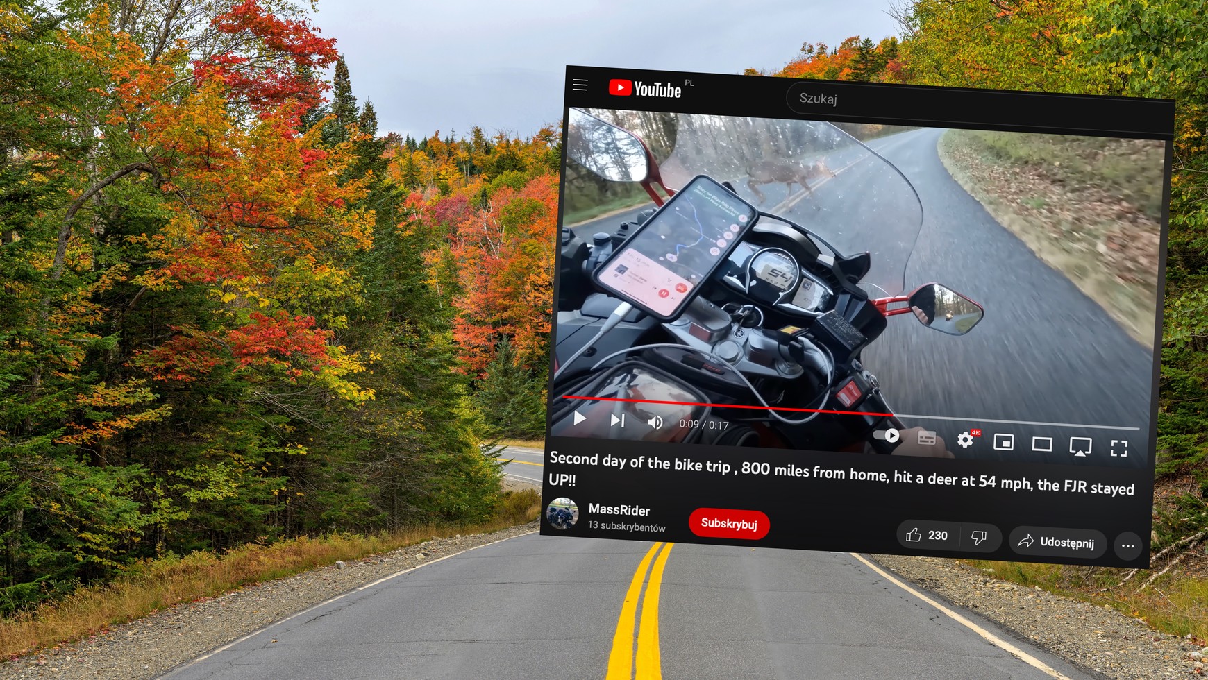 Wideo z tego feralnego zdarzenia opublikował na swoim kanale na YouTube MassRider. Mężczyzna wybrał się na wycieczkę swoją Yamahą FJR 1300. W drugim dniu podróży, gdy był już niemal 1,3 tys. km (800 mil) od domu, podczas pokonywania długiego zakrętu zderzył się z jeleniem, który chciał przedostać się na drugą stronę drogi. Wszystko odbyło się tak szybko, że kierowca jednośladu nie zdążył zareagować.