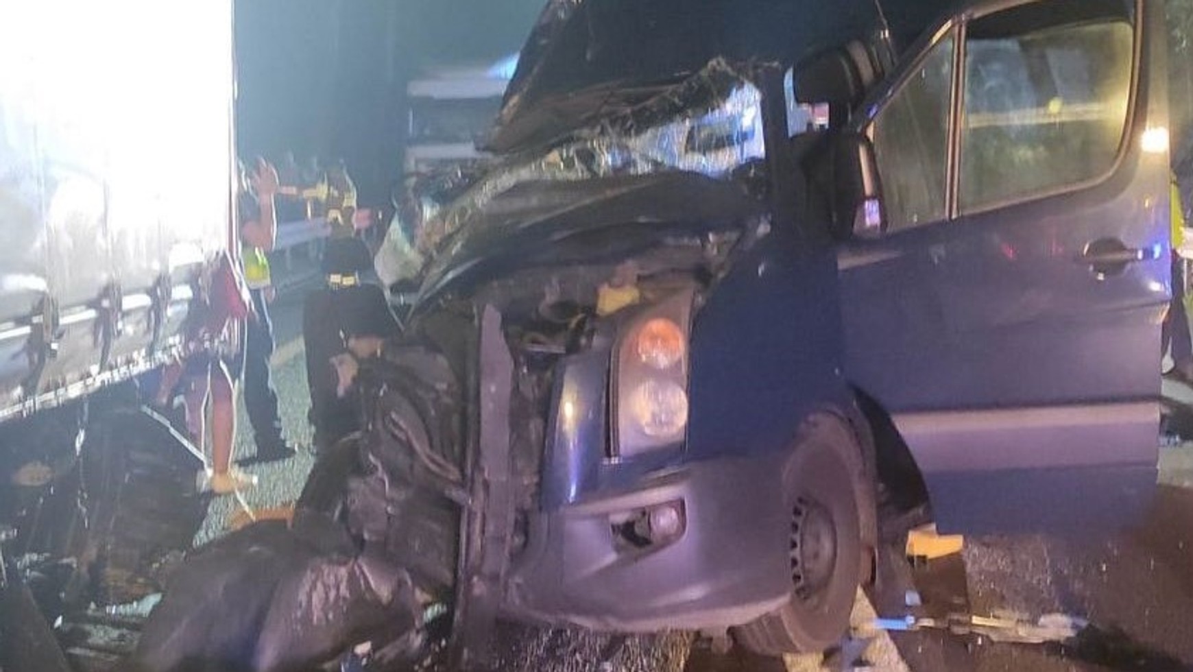 Łącznie w mikrobusie jechało dziewięć osób. Dwoje dzieci i czterech dorosłych odniosło obrażenia i trafiło do szpitala. Jak widać na zdjęciu, siła uderzenia musiała być potworna, ponieważ z mikrobusa niewiele zostało.