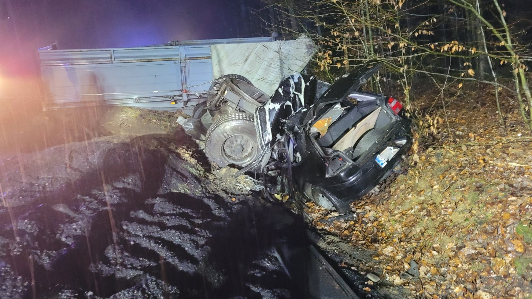 "Uszkodzeniu uległ zaczep samochodu ciężarowego. Przez to przyczepa, na której przewożono 17 ton miału węglowego, samoistnie zjechała na przeciwny pas ruchu przed nadjeżdżający samochód" – powiedział strażak. Przyczepa zepchnęła samochód do rowu i przygniotła go.