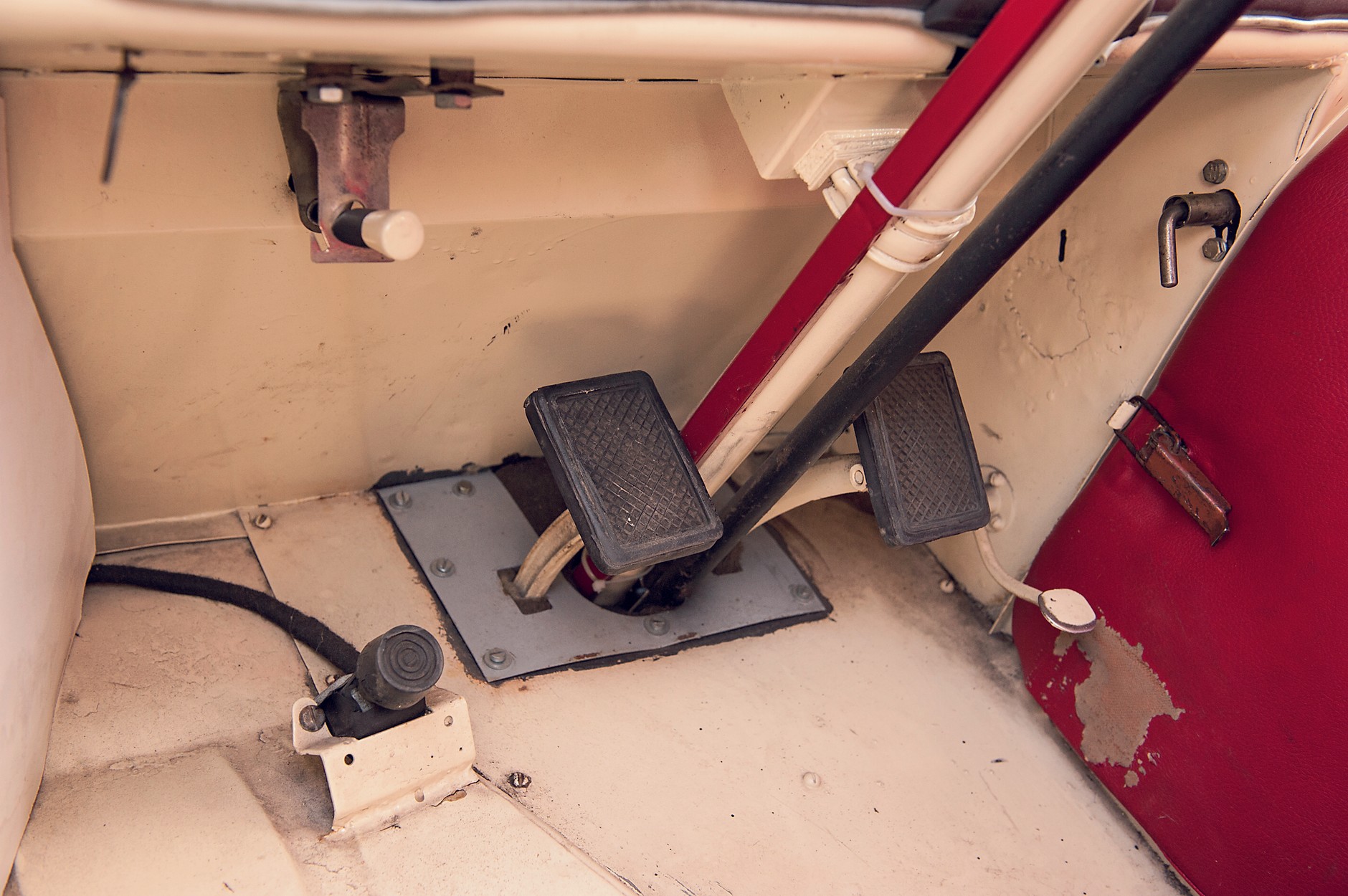 W Fiacie 126p dźwigienki znajdujące się między przednimi fotelami służyły do sterowania ssaniem i rozrusznikiem.