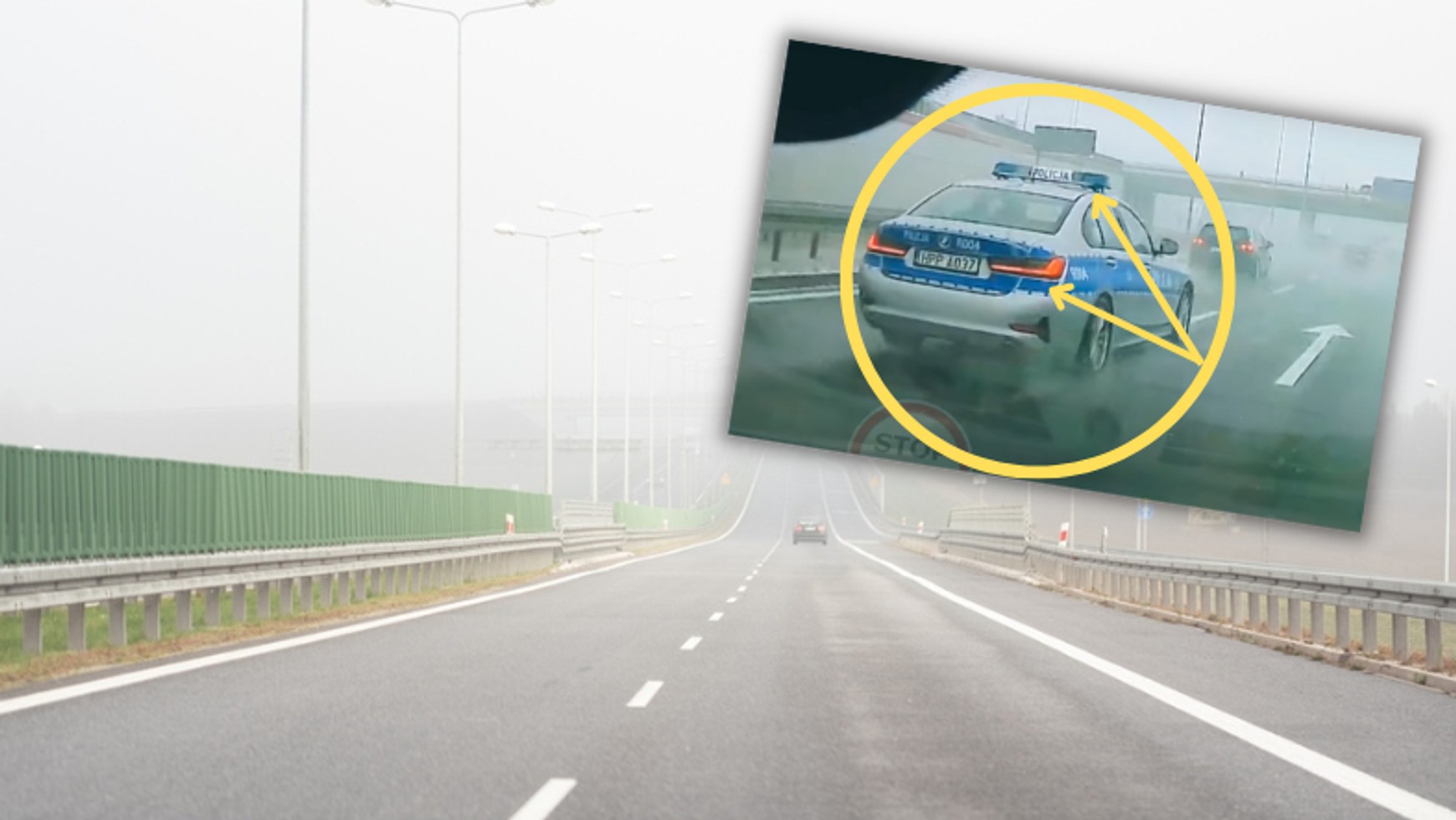 Samochód przy dużej prędkości i mokrej nawierzchni w sposób niesygnalizowany próbuje zmienić pas. Autor nagrania trąbi na radiowóz, ostrzegając przed zajechaniem drogi i spowodowaniem potencjalnie niebezpiecznej sytuacji. Z nagrania nie wynika też, czy blisko za autorem filmu nie jechał inny pojazd.