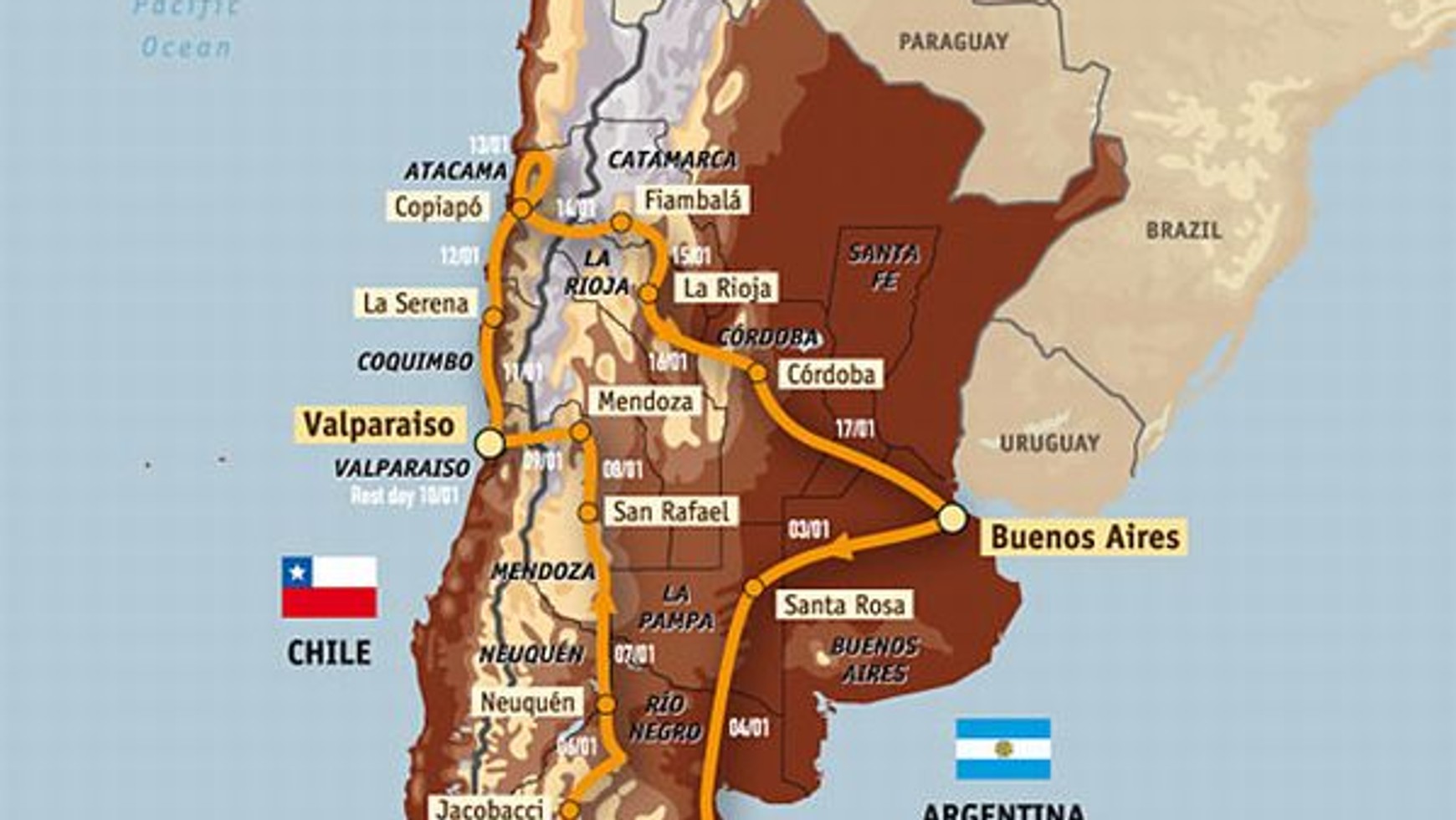 Impreza zakończy się 16 stycznia. Trasa długości ponad 10 tysięcy kilometrów została podzielona na 15 etapów. Dzień przerwy przewidziany jest na 9 stycznia w miejscowości Antofagasta.