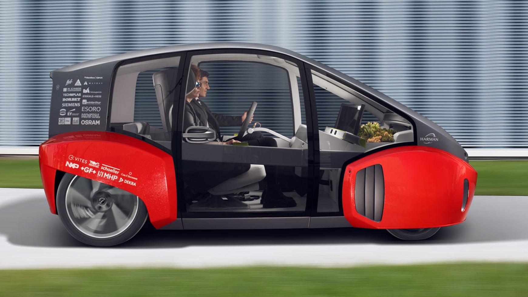 Małe 2-osobowe, elektryczne miejskie auto ma na pokładzie oprócz nowoczesnych urządzeń audio-wideo także... malutki ogród. Wygospodarowano na niego miejsce pod przednią szybą.