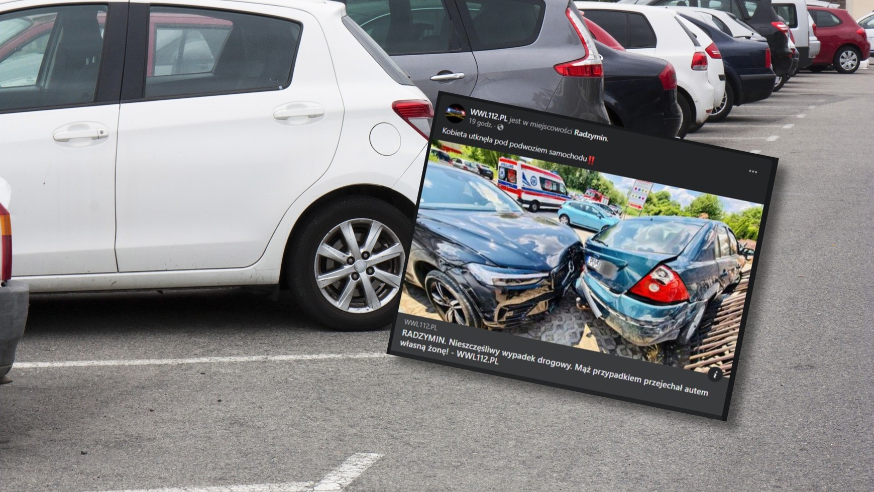 Niecodzienny wypadek miał miejsce 19 czerwca 2023 r. ok. godz. 12.20 przy ul. Strzelców Grodzieńskich w Radzyminie (woj. mazowieckie). Mężczyzna siedzący za kierownicą samochodu marki Volvo wjechał pojazdem w swoją żonę, która, stojąc obok auta, próbowała ułatwić mężowi wyjazd z parkingu pod sklepem ortopedycznym.