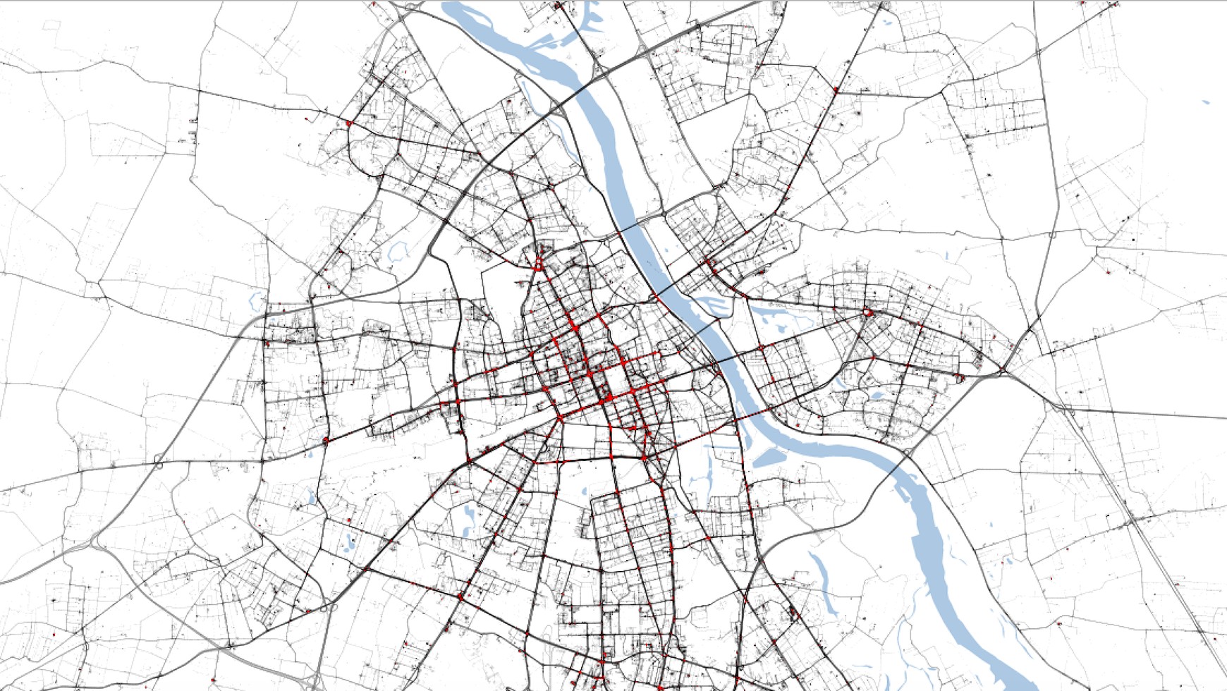Mapa natężenia ruchu. Im ciemniejszy kolor tym większe natężenie ruchu. Kolor czerwony to korki