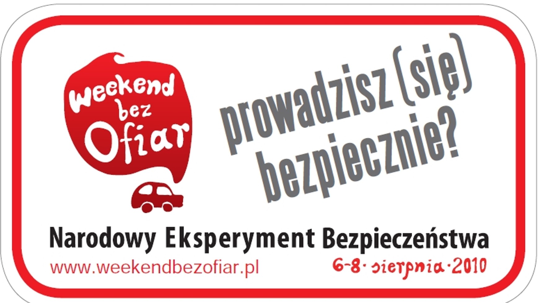 Od dzisiaj zachęcać będziemy Polaków, by dołączyli do Narodowego Eksperymentu Bezpieczeństwa i jeździli bezpiecznie. Akcję poprzeć można za pośrednictwem strony internetowej www.WeekendBezOfiar.pl, zostając fanem profilu w serwisie społecznościowym Facebook, a w weekend 6-8 sierpnia 2010 r. – przyklejając na tył swojego pojazdu dołączoną do wybranych tytułów prasowych nalepkę z apelem o bezpieczną jazdę. Kampanii towarzyszyć będą działania edukacyjne.