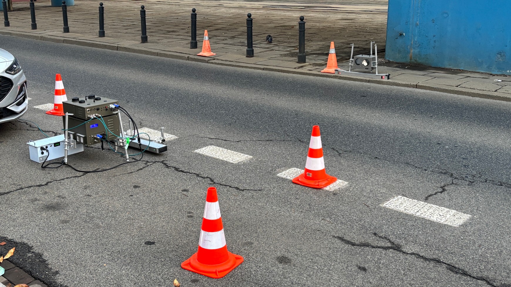 Stanowisko jest oznakowane słupkami i tablicą z napisem "zdalne pomiary emisji spalin". Zaparkowany jest przed nim furgon drogowców, za którym znajduje się samochód osobowy firmy wykonującej pomiary. Podłączone są do niego dwa urządzenia rejestrujące i kamera.