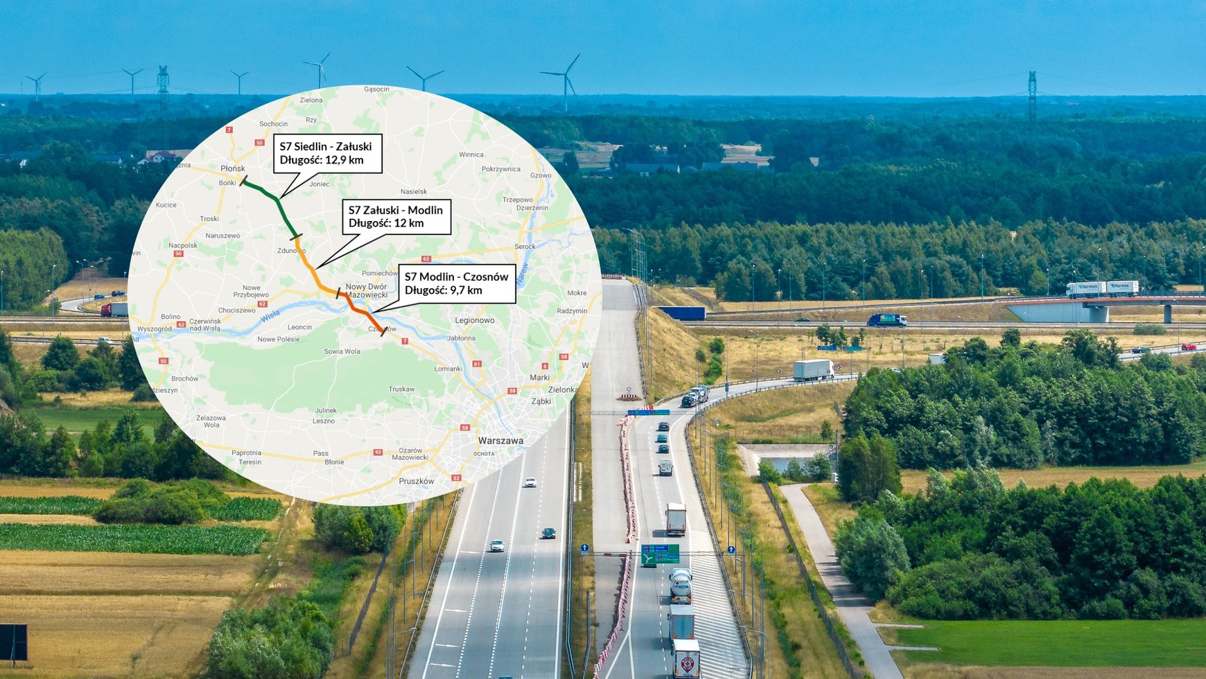 - Na S7 na północ od Warszawy czekamy na trzy ostatnie odcinki siódemki: Płońsk Południe — Załuski, Załuski — Modlin oraz Modlin Czosnów. Realizacja wszystkich zmierza ku końcowi. Najwięcej prac zostało na tym pierwszym. Został zbudowany na razie w 64 proc.