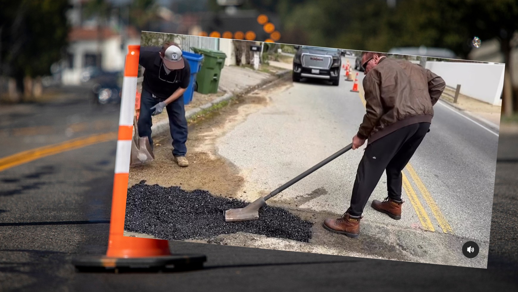 Na filmie widać, jak aktor razem ze swoją ekipą wypełnia lukę w jezdni specjalną mieszanką. W pewnym momencie podjeżdża nawet jedna z sąsiadek, która z wyraźną ekscytacją dziękuje Schwarzeneggerowi za to, że zajął się irytującą dziurą. Były gubernator Kalifornii przyznał, że sam kilka razy zgłaszał ubytek w jezdni, ale po trzech tygodniach oczekiwania wziął sprawy w swoje ręce. Po krótkiej pogawędce ubił mieszankę wyrównującą dziurę i zasypał ją piaskiem. Jak przyznał, woli działać niż czekać i narzekać.