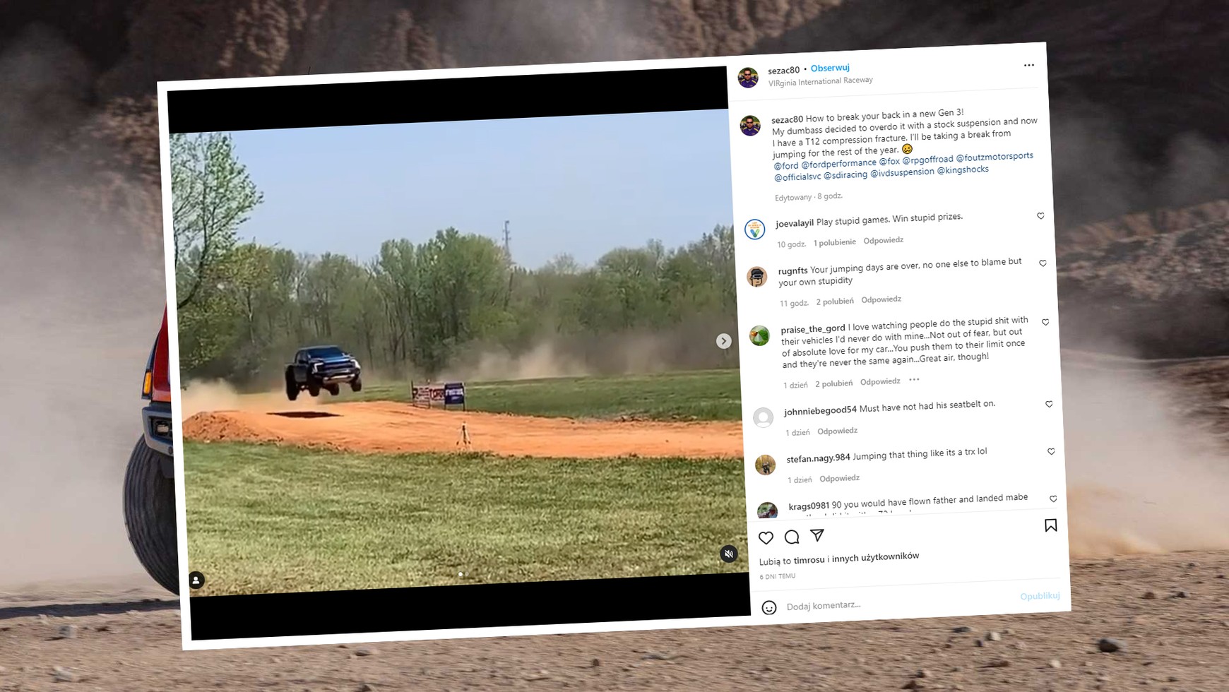 Tę jego możliwość podczas imprezy Off-Road Revolution, zorganizowanej na torze wyścigowym Virginia International Raceway chciał sprawdzić kierowca Raptora trzeciej generacji. Pierwszy skok, przy prędkości ok. 45-50 mil na godz. (ok. 72-80 km/h) udał się bez problemów. Kolejny niestety skończył się dla kierującego Fordem poważnym urazem. Caz (właściciel auta) w wyniku twardego lądowania doznał złamania kompresyjnego kręgu T12 (ostatni krąg odcinka piersiowego kręgosłupa).
