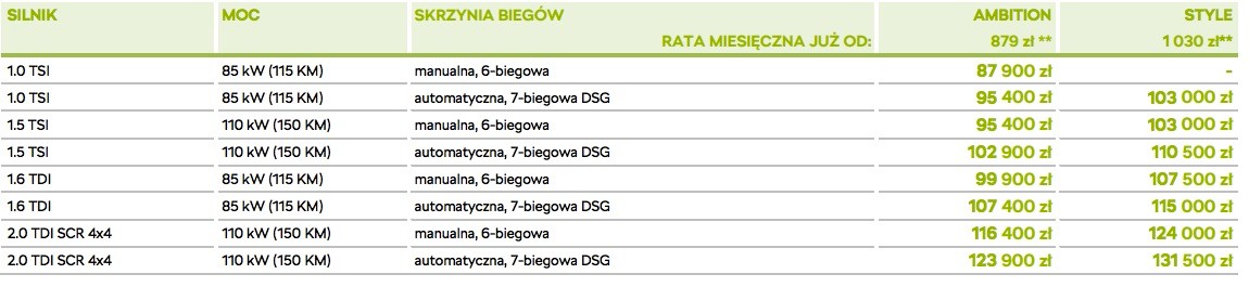 Skoda Karoq w podstawowej wersji jest napędzana silnikiem 1.0 osiągającym maksymalnie 115 KM. Wersję podstawową, czyli Ambition wyceniono na 87 900 zł. Jeśli zdecydujemy się na automatyczną skrzynię biegów, to cena małego SUV-a Skody w podstawowej wersji osiągnie imponujące 95 400 zł.