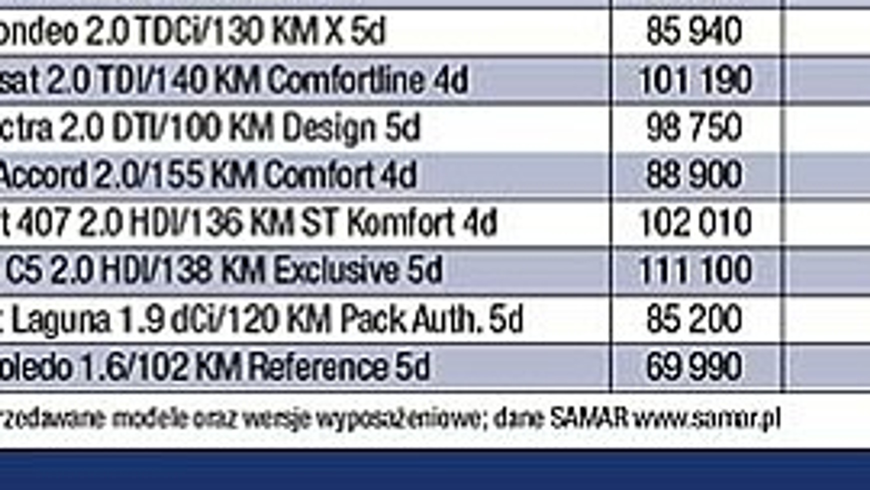 aut klasy średniej, to przeszło o 23,1 proc. mniej niż w 2004 roku. Udział tej grupy samochodów w rynku krajowym przekracza obecnie 16,1 proc. Na ofertę segmentu składa się ponad 30 modeli 26 producentów - w zdecydowanej większości europejskich.Ofertą promocyjną objęto teraz wszystkie modele stanowiące czołówkę segmentu. Wysokie rabaty dotyczą rocznika 2005. Najwięcej można zaoszczędzić, kupując CitroĎna C5, Renault Lagunę lub Seata Toledo. Niektóre firmy proponują dodatkowe wyposażenie gratis (Toyota - czujnik parkowania i alarm) lub w atrakcyjnej cenie. Bogata jest oferta finansowa (kredyty, leasing, ubezpieczenie).Liderem segmentu pozostaje Skoda Octavia (9937 sprzedanych egzemplarzy w 2005 r.). Rosnącą popularnością cieszą się również droższe modele klasy średniej: Subaru Legacy (18 lokata, 312 sztuk), Saab 9-3 (22 miejsce, 145 aut) czy BMW serii 3 (13 lokata, 663 auta).