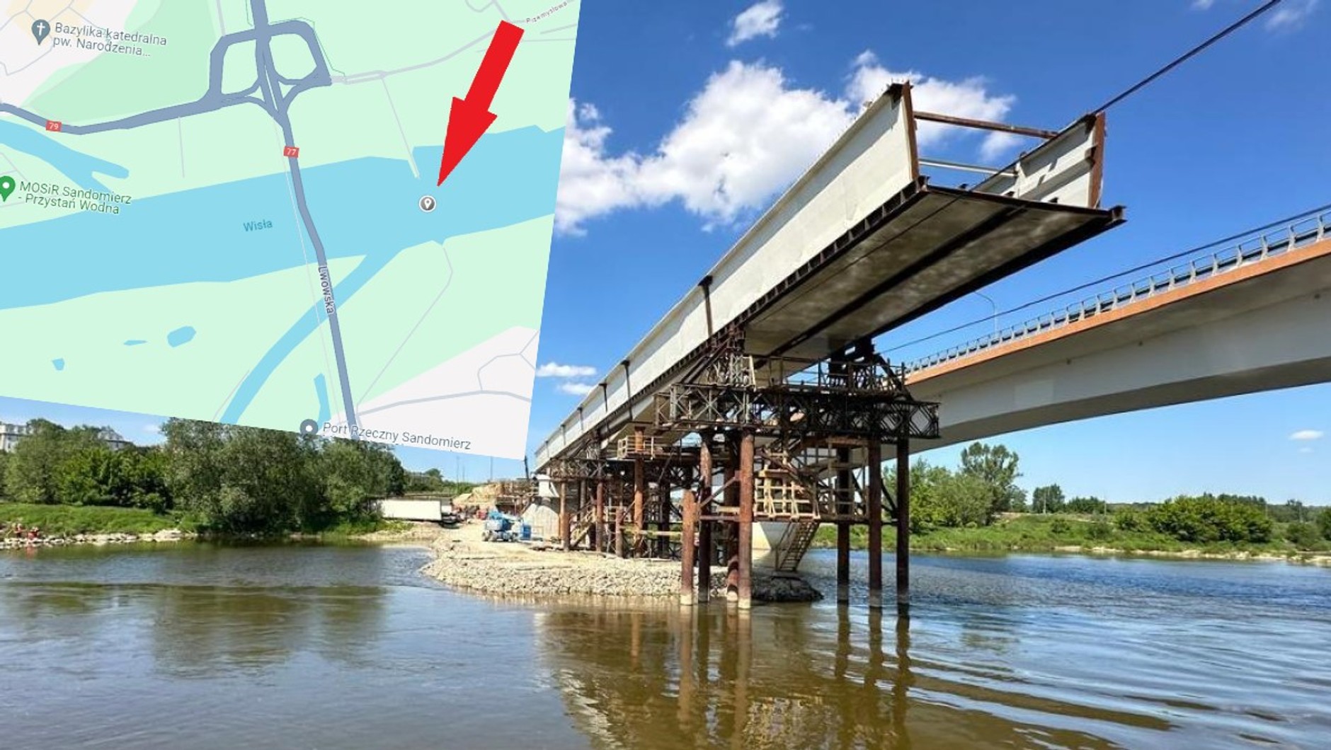 Drogowcy montują stalową konstrukcję mostu od listopada ubiegłego roku. Co ciekawe, mimo że będzie to nowy obiekt, wykorzystuje on odświeżone podpory starej, 70-letniej przeprawy. Poprzednia stalowa konstrukcja nie spełniała już standardów, więc w 2013 r. została wyłączona z użytku. Podpory wystarczyło jednak tylko wzmocnić i nabudować na nich nowe oczepy.