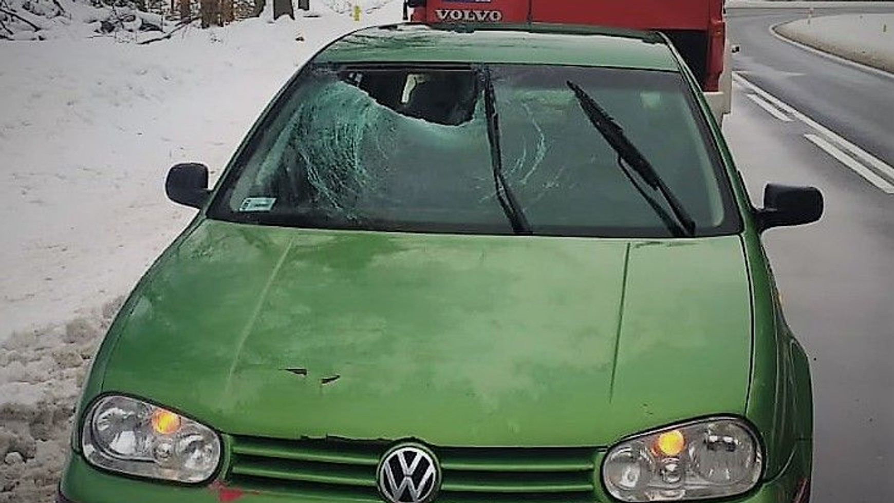 Policjanci po dotarciu na miejsce ustalili, że na zakręcie z samochodu dostawczego spadła tafla lodu i przebiła szybę Volkswagena. W wyniku zdarzenia pasażer Volkswagena został przewieziony do szpitala.