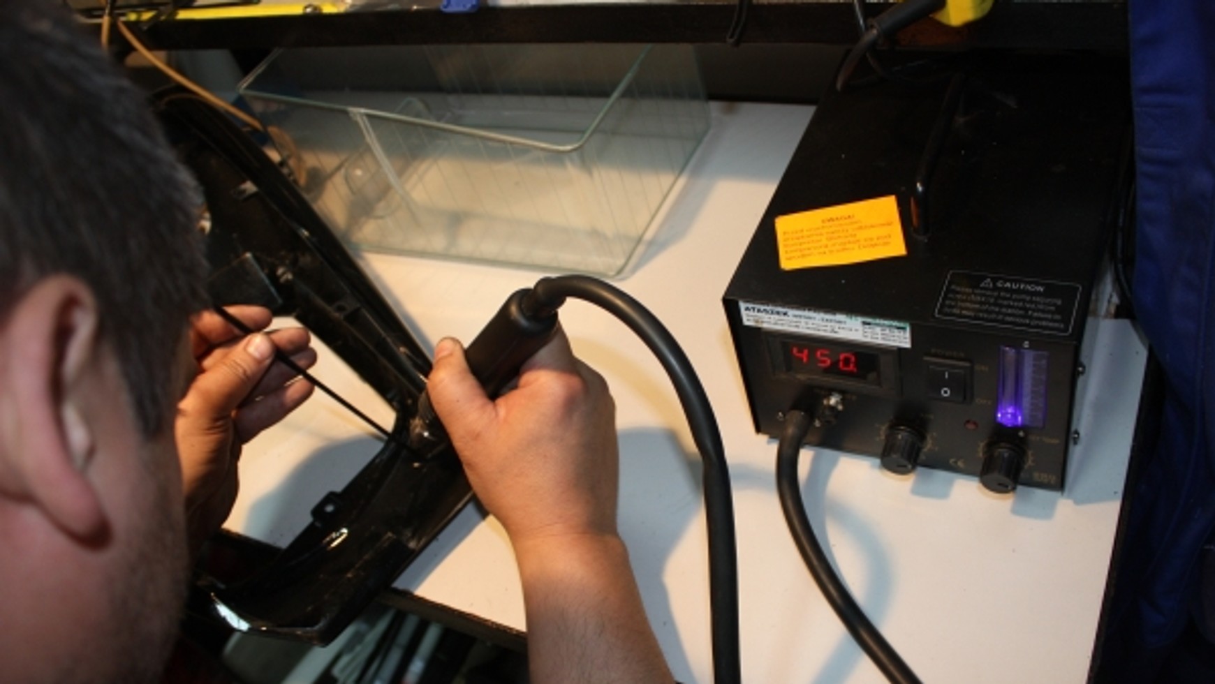 Dla powodzenia całej operacji znaczenie ma temperatura powietrza - zwykle różna dla różnych rodzajów termoplastów (np. dla materiału typu ABS wynosi 350°C). Jeśli spawany element jest tylko pęknięty, przeznaczoną do spawania szczelinę poszerzamy tak, aby rowek miał kształt litery V. Chodzi o to, aby zwiększyć powierzchnię łączenia i poprawić stabilność spawu. Wzdłużne pęknięcia najlepiej spawać, prowadząc dyszę równolegle do linii spawu. Wtedy drut spawalniczy sam układa się we właściwym miejscu. Duże nierówności lub wybrzuszenia w miejscu spawania wyrównuje się szlifierką. Gdy miejsce spawu jest dokładnie wypełnione, można część oddać do lakiernika, który spoinę zaszpachluje, oszlifuje i polakieruje.