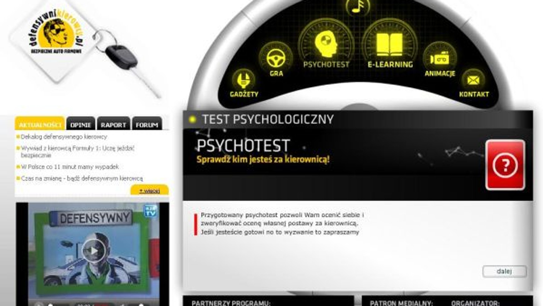 Obok kluczowego dla programu defensywnikierowcy.pl kursu e-learningowego, na stronie pojawił się również test psychologiczny: "Sprawdź, kim jesteś za kierownicą". Stworzony specjalnie na potrzeby serwisu test ma pokazać, że nasze emocje, postrzeganie i interpretacja zachowań innych uczestników drogi wpływa w sposób pośredni i bezpośredni na bezpieczeństwo ruchu drogowego.