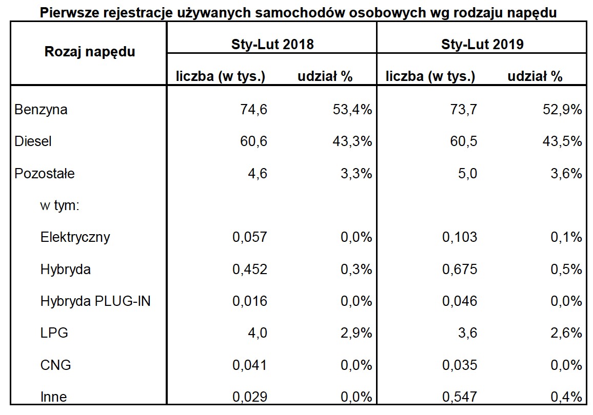 Większą popularnością cieszą się auta używane z silnikami benzynowymi niż Diesla - 52,9 do 43,5 proc. Niewiele sprowadzamy samochodów z instalacjami LPG (2,6 proc.). Auta hybrydowe i elektryczne stanowią margines – ich udział wynosi 0,5 proc. i 0,1 proc.