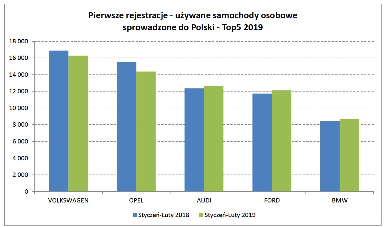 Auta których marek najczęściej trafiają do Polski? Tutaj nie ma żadnego zaskoczenia. Najwięcej sprowadzamy Volkswagenów – 16 285 sztuk w okresie styczeń-luty 2019) i Opli (14 370 sztuk) - chociaż mniej niż przez dwa pierwsze miesiące 2018 r. Podobnym zainteresowaniem cieszą się Audi i Ford – sprowadzono ich odpowiednio: 12 623 i 12 117 sztuk. Listę Top 5 zamyka BMW z liczbą 8 711 zarejestrowanych sztuk z zagranicy.
